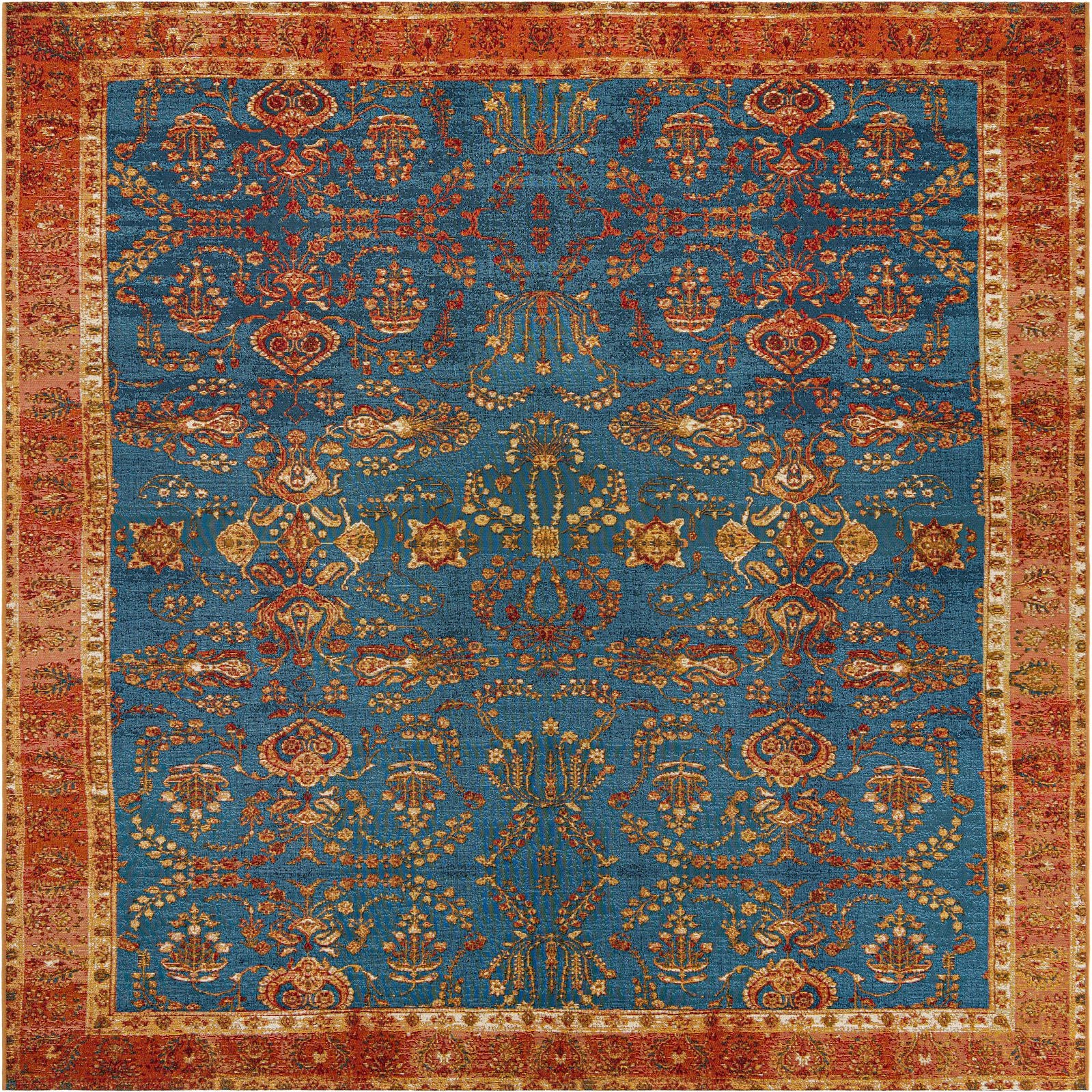 An 8x10 rectangular indoor/outdoor rug featuring a vibrant blue field with intricate orange, red, and gold traditional Oriental patterns, framed by a rust-colored border.