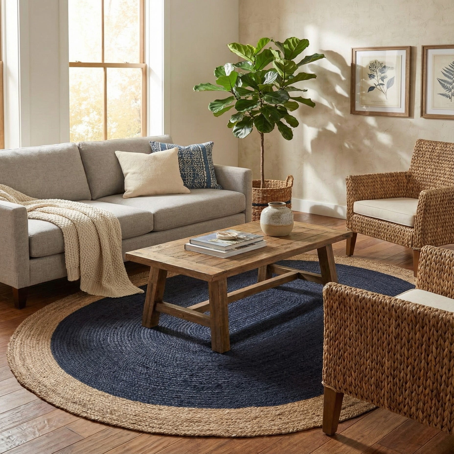 This rug suits casual and transitional interiors — try it beneath a dining table to soften wood floors, centered in a living room seating group, or placed in a sunroom or entry to introduce natural texture. It pairs well with light linens, leather seating, warm wood finishes, and nautical or farmhouse accents, bringing a grounded, lived-in feel to both coastal and cottage-inspired schemes.