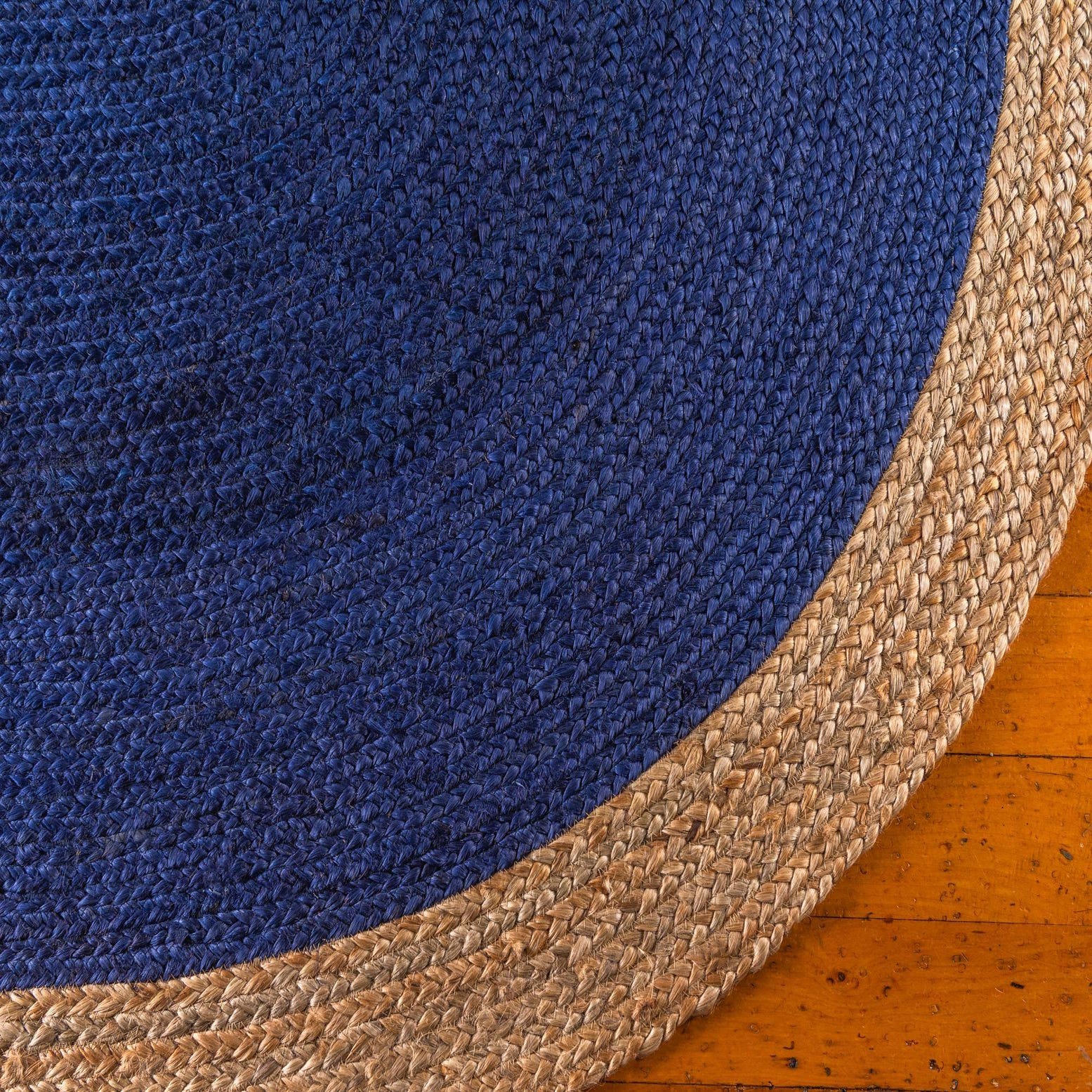 Hand-braided from 100% jute, this oval rug pairs a deep navy blue field with a natural tan outer band for a clean, two-tone look. The braided construction creates subtle concentric ridges you can feel underfoot, giving the surface a tactile, low-profile texture that layers nicely over hard floors. The navy center provides a strong visual anchor while the tan border adds warmth and a handcrafted touch.