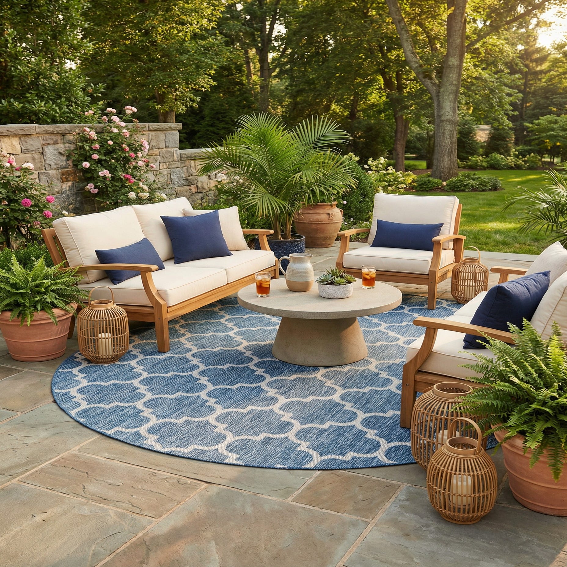 Machine made from 100% polypropylene, the rug has a low-pile, tightly woven surface that feels firm underfoot with a subtle nubby texture where the lattice motif rises against the smoother ground. Its durable construction and forgiving texture make it well suited to covered patios, sunrooms, or poolside seating areas, and it also translates nicely indoors in a casual dining room, an entryway layered over hardwood, or a living room with coastal or transitional decor. Pair it with neutral outdoor cushions, wicker or teak furniture, or crisp white linens to play up the navy-and-gray contrast.