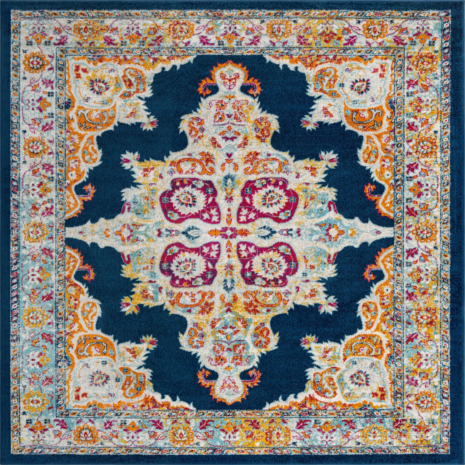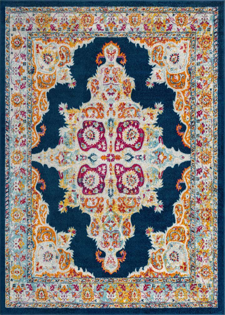 Primary color is Navy Blue. Colors in this rug include: Navy Blue, Beige, Blue, Brown, Gold, Gray, Ivory, Pink, Yellow.
