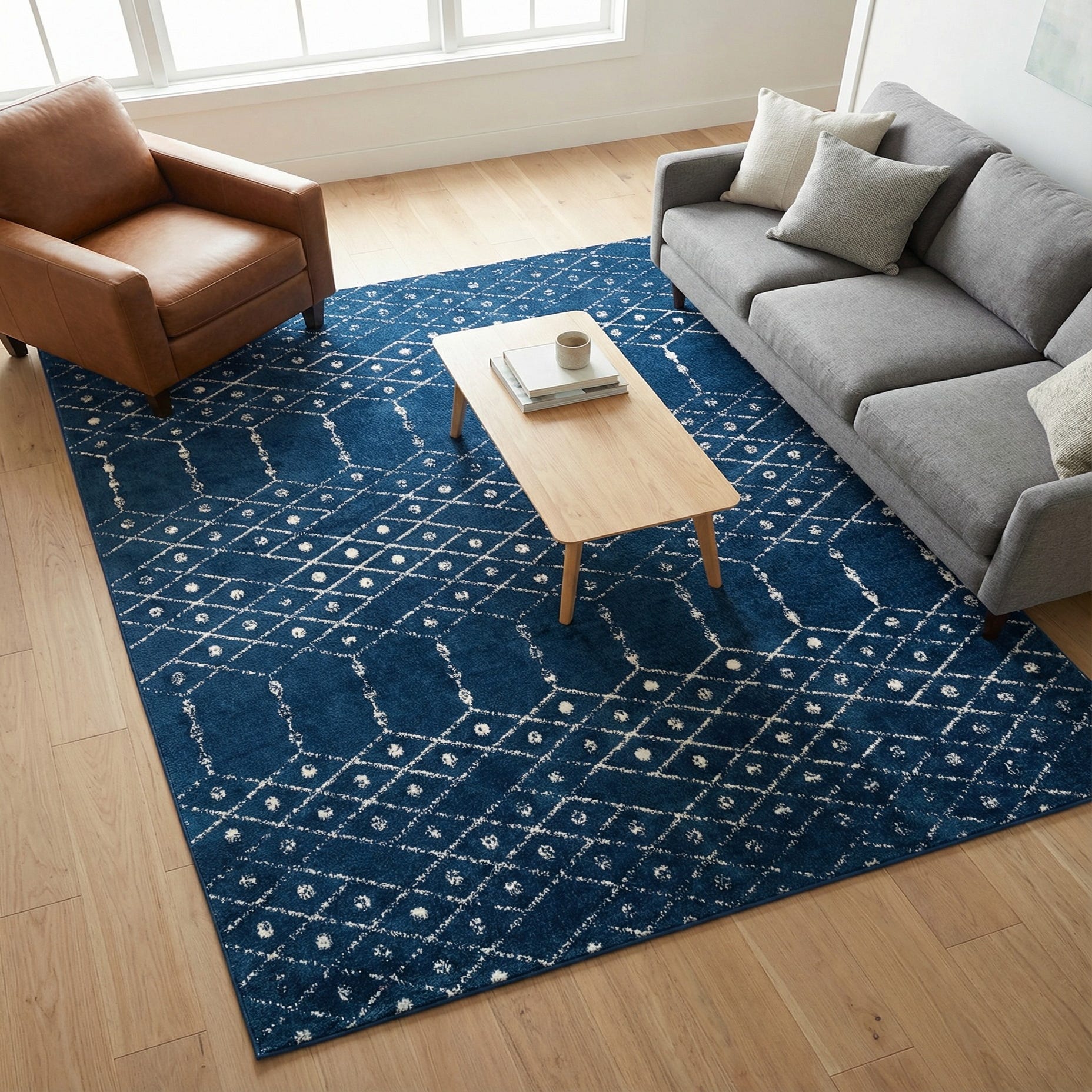 This rug works well as an anchor in living rooms beneath a coffee table, layered under a dining table to define the space, or placed at the foot of a bed to add pattern without overwhelming. It pairs nicely with light woods and white upholstery for a coastal or contemporary palette, and also complements warm neutrals and brass accents in a transitional setting.