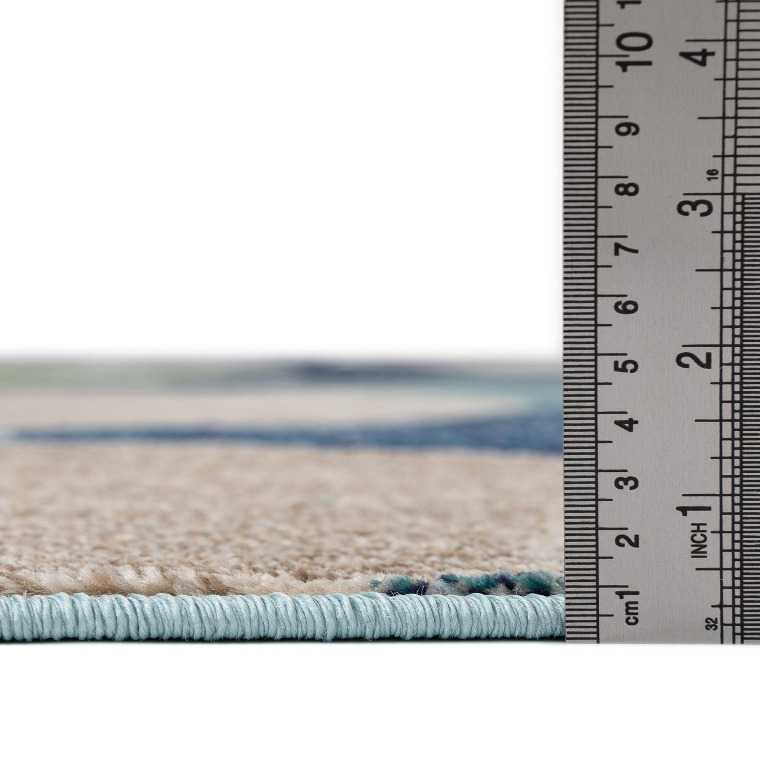 Machine made from 100% polypropylene, the construction offers a consistent weave and an easygoing hand that works well under furniture. Place this rug beneath a living room sofa to anchor a modern seating area, layer it in a coastal-inspired family room with light woods and white upholstery, or use it to add pattern and color to a contemporary home office or playroom. The navy background keeps the palette grounded while the lighter beige and green circles bring brightness, making it versatile for both neutral and colorful interiors.