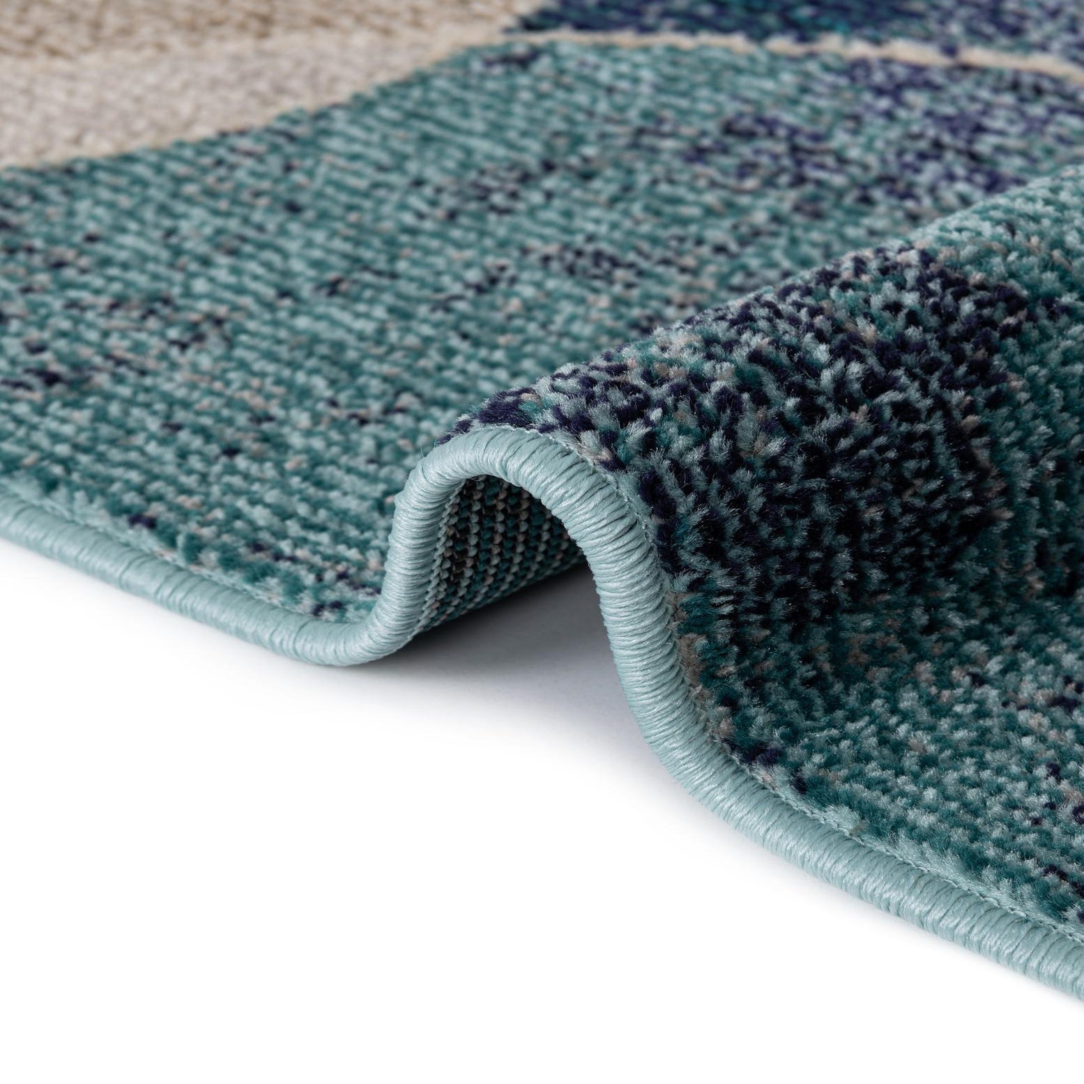 A field of deep navy blue provides a bold backdrop for a composition of overlapping circles in beige, blue, brown and light green. The graphic, contemporary pattern balances large and medium-scale rounds so the design reads both lively and composed; some circles carry a softly mottled, speckled surface while others have a smooth, even finish, creating visual depth across the rug. Running your hand over the surface reveals a low, slightly dense pile with a clean, sheared texture that highlights the color transitions and the subtle distressed detailing.