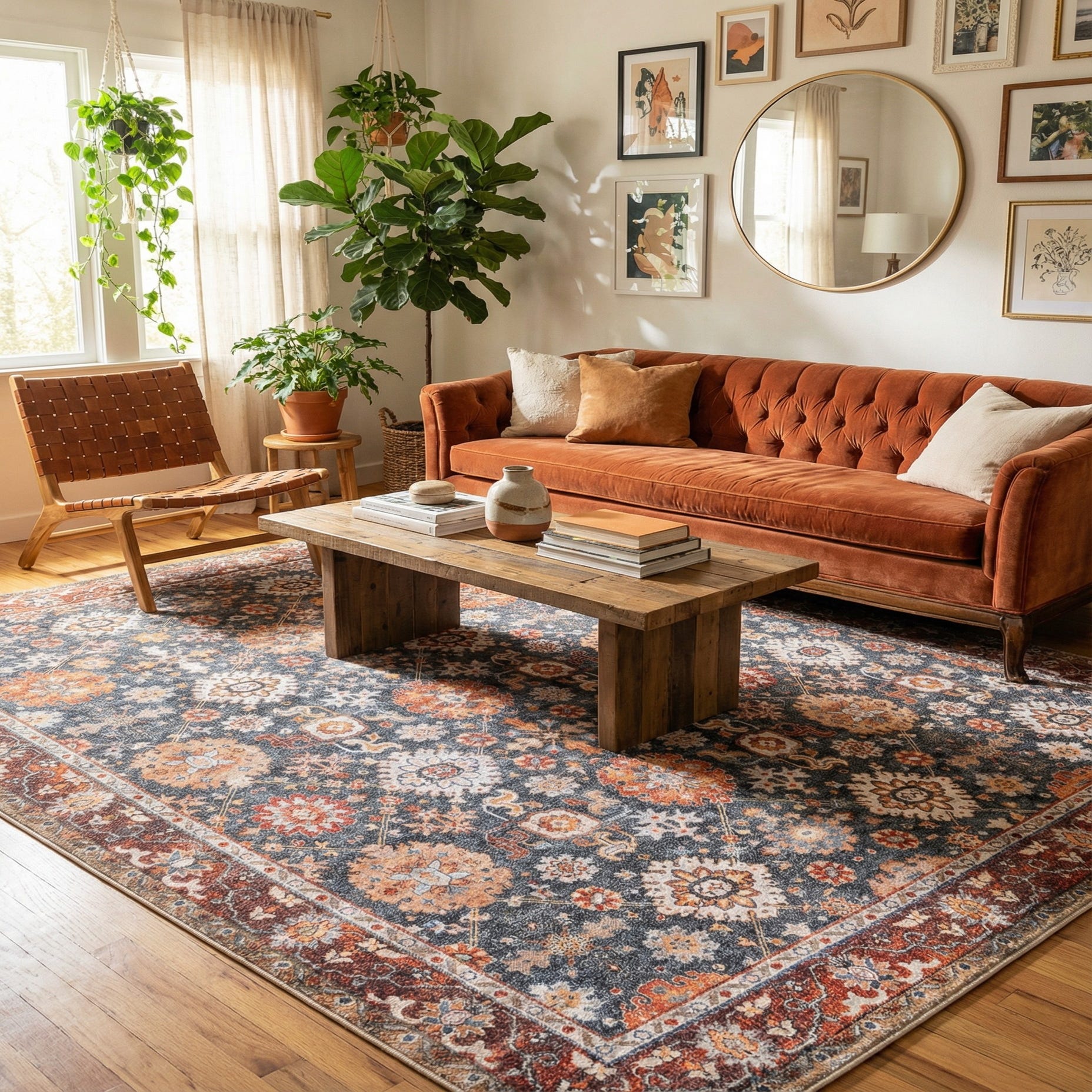 Woven from 100% polyester, the rug has a low pile with a soft, smooth hand and a subtle sheen that enhances the color depth and pattern clarity. It anchors a living room seating area effortlessly, pairs with leather sofas or ivory upholstery, and complements warm wood floors and brass or gold accents. Equally at home beneath a dining table or layered in a bedroom, it suits traditional, transitional, and eclectic interiors where rich color and detailed patterning add warmth and character.