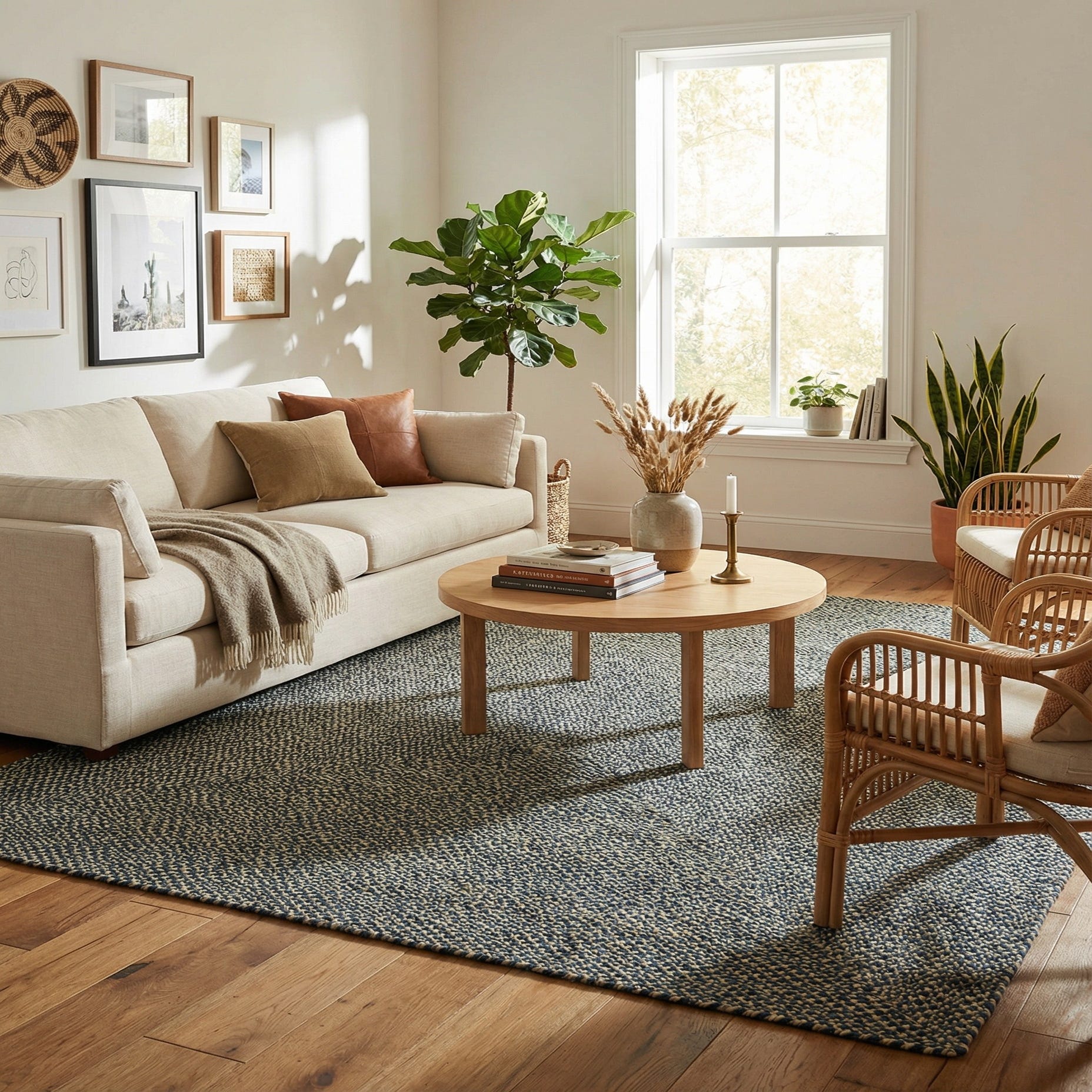 This rug works well in casual modern, coastal, or farmhouse settings where natural texture and layered neutrals are key. Place it in an entry, under a coffee table in the living room, or beneath a dining table to anchor the space; it pairs nicely with warm wood tones, linen upholstery, navy accents, woven baskets, and metal or rattan furnishings. The understated pattern and neutral palette make it a versatile foundation for both patterned and solid furnishings.