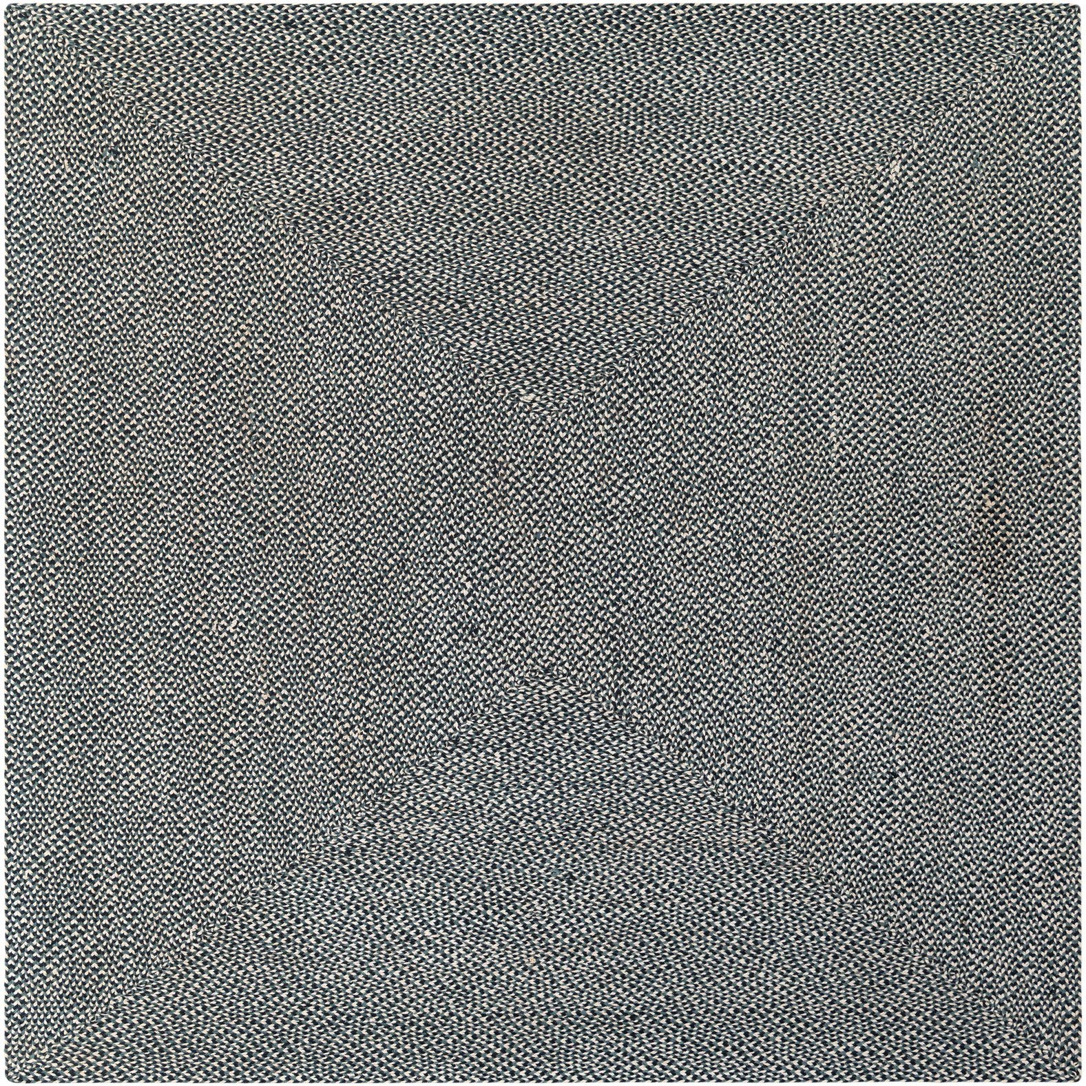 A hand-braided construction in 100% jute gives this rug a tactile, low-profile surface with a distinctly woven feel. The navy blue background sets a rich base while interwoven ivory and gray fibers create a tweed-like effect across the field. Braided rows shift direction to form a subtle geometric, almost diamond-like motif that reads as structured yet organic—the texture is slightly coarse to the touch, with firm braided ridges that add visual depth without a high pile.