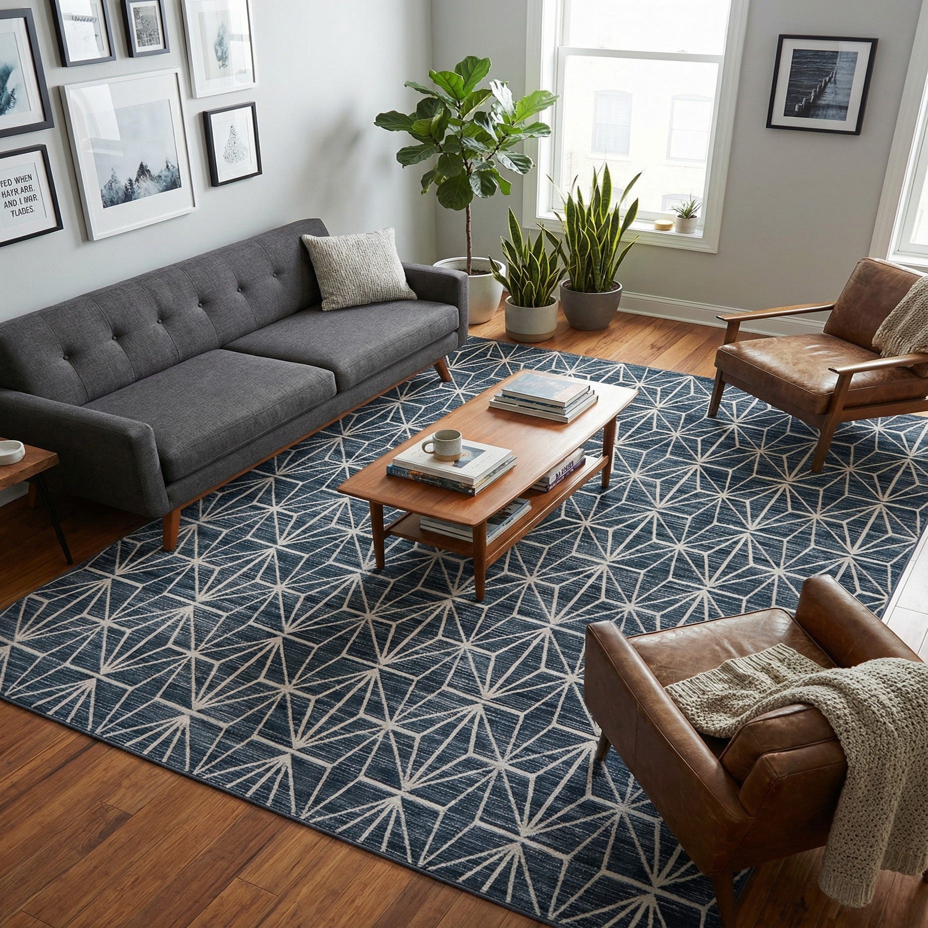 This rug works well in contemporary and transitional interiors—use it to anchor a living room seating area, ground a dining table, or add contrast to a serene bedroom. Pair it with light- to medium-toned woods, matte metal accents, and neutral linens to highlight the navy-and-ivory palette, or combine with streamlined furniture for a crisp, modern look.
