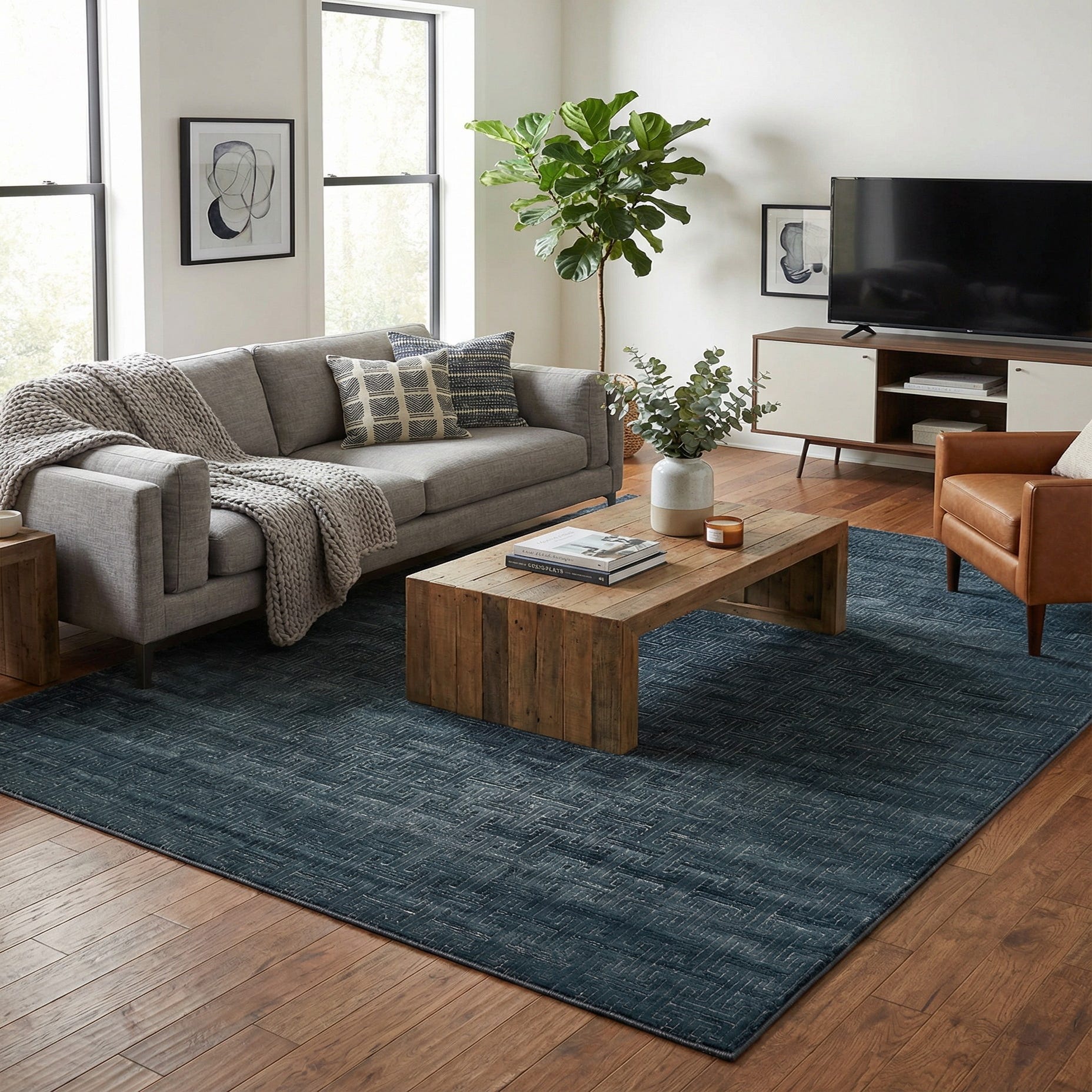 The Uptown Collection presents a tastefully understated 8x10 rug with a deep navy blue background accented by an ivory distressed pattern, offering a contemporary take on a classic color combination. Machine-woven from a blend of 70% polypropylene and 30% polyester, this rug provides a soft texture underfoot with the added benefits of being stain-resistant and shed-free, ensuring easy maintenance and long-lasting durability. The subtle variation in the rug's hue, created by the high-low pile effect, adds depth and texture to its overall appearance.