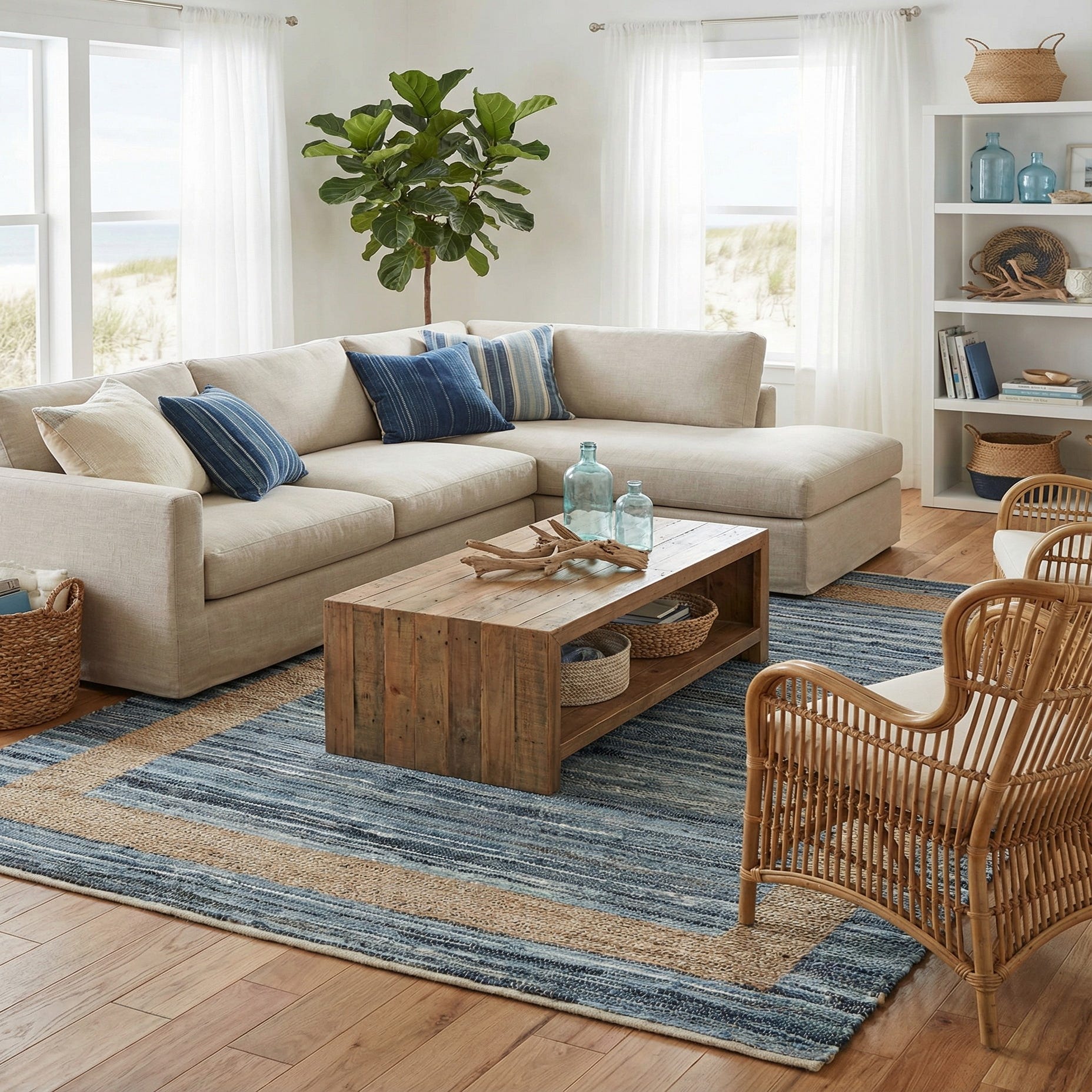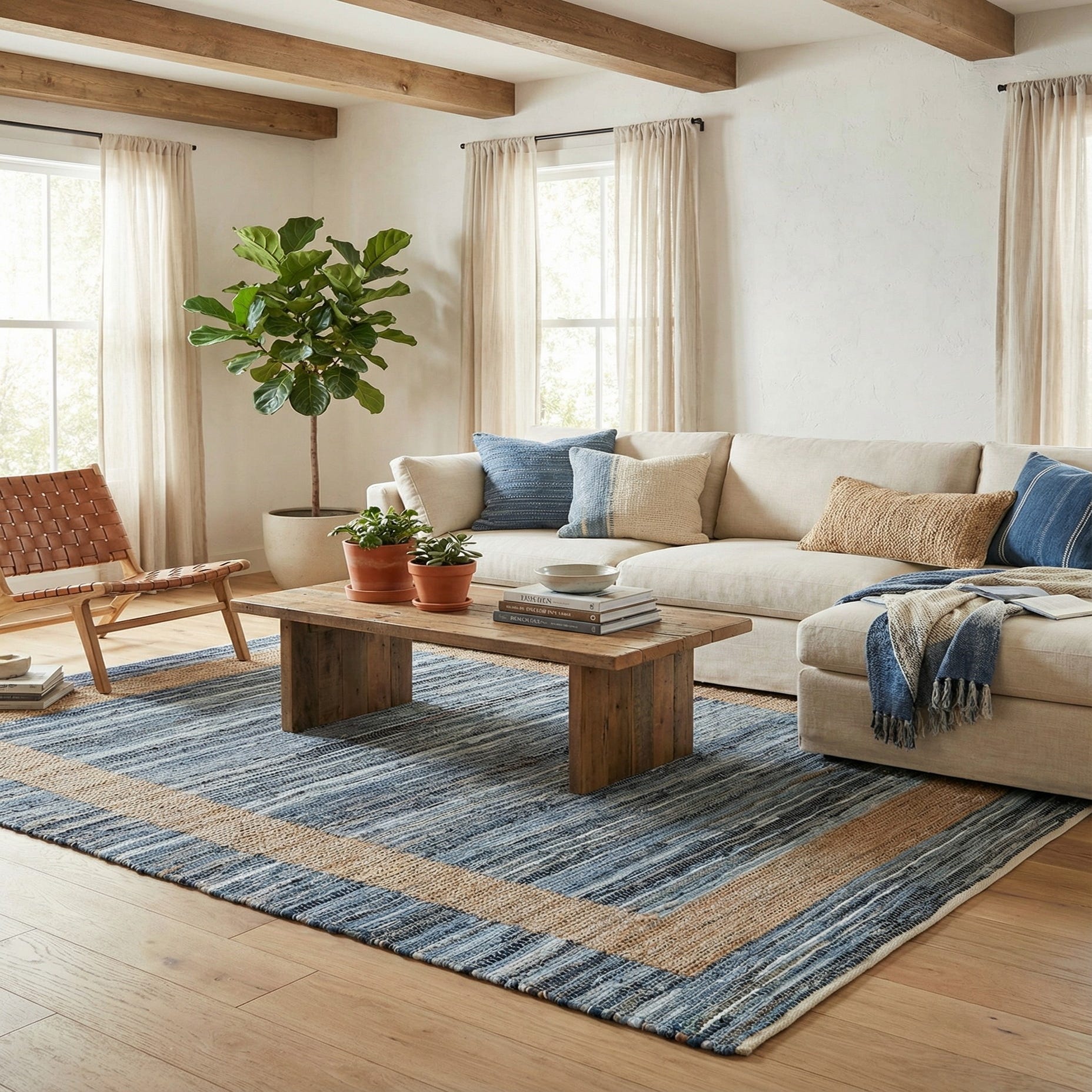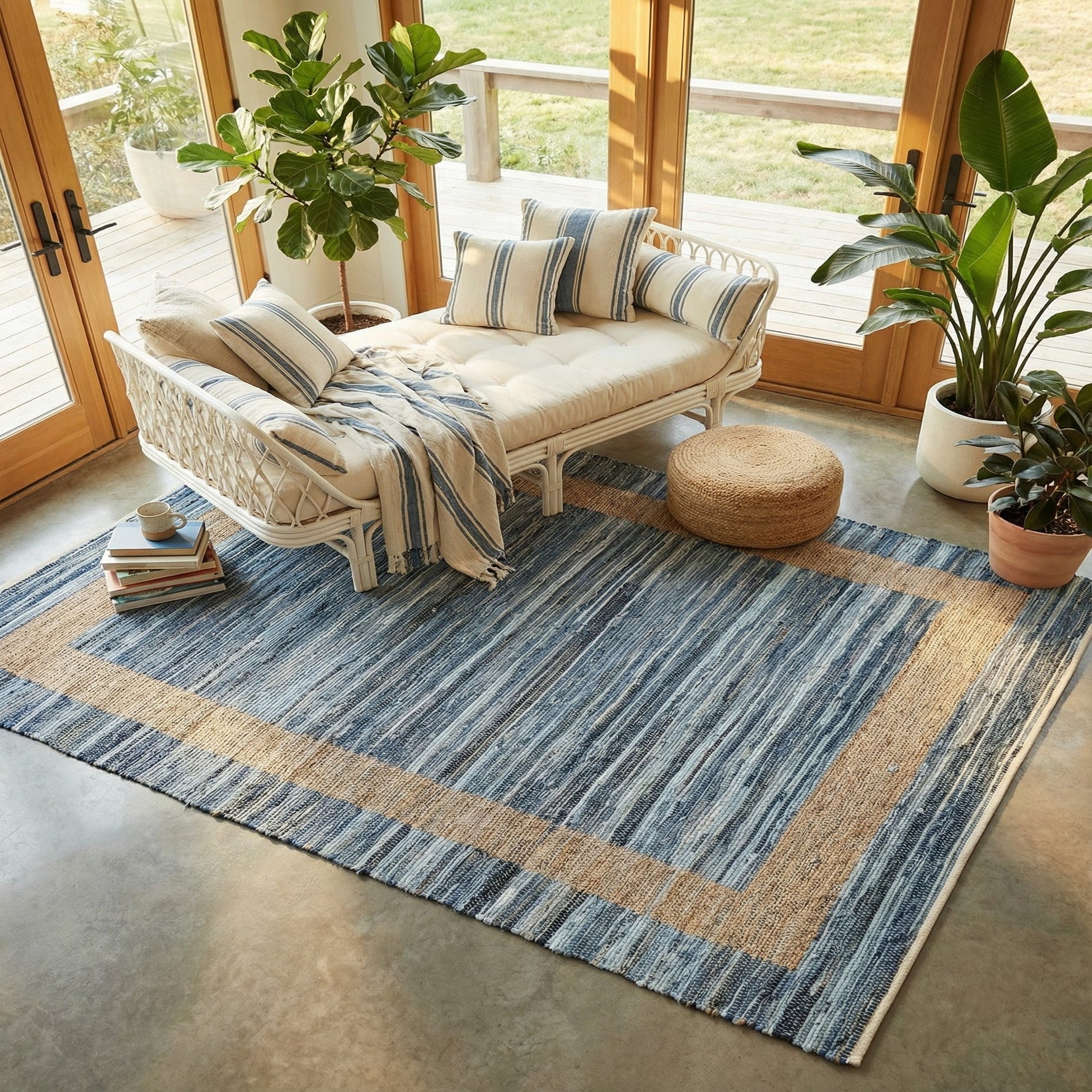 Made of 60% denim cotton and 40% jute, the surface is low-profile and textured: the cotton ribbons lend softness and tonal variation while the jute provides structure and an earthy feel. Use it to anchor a living room seating area beneath a coffee table, under a dining table to add warmth and contrast with wood, or layered in a bedroom to introduce pattern and tactile interest. It also works well in sunrooms or relaxed coastal-style interiors where mixed natural materials are part of the scheme.