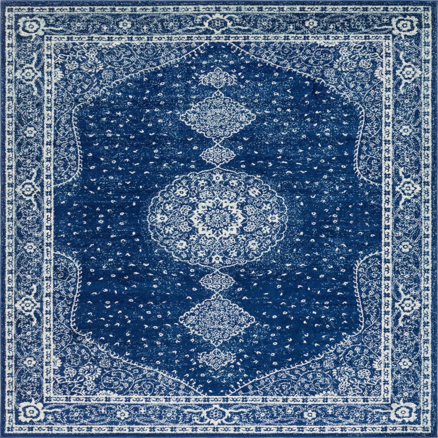 A classic medallion layout gives this rug a timeless, Persian-inspired look: a circular ivory medallion sits on a navy blue background, linked by smaller diamond motifs and surrounded by a layered floral border in ivory and blue. Tiny floral dots across the field add texture and visual movement, while the distressed, slightly faded effect softens the contrast between the navy ground and the ivory detailing. Machine made of 100% polypropylene, the rug has a low-profile pile with a pleasantly soft hand and a tightly woven face that feels substantial underfoot.