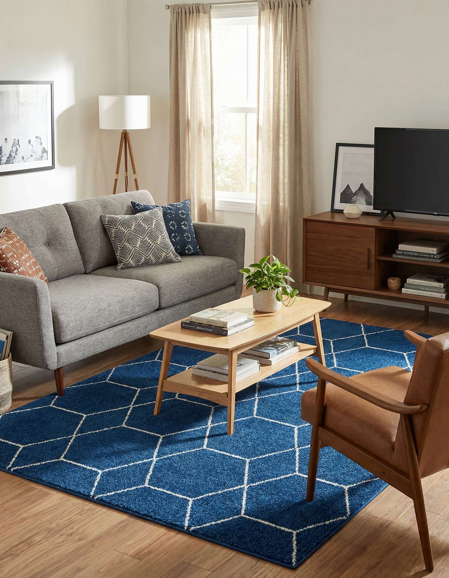 A rectangular 8x11 navy blue area rug with a repeating white geometric trellis pattern, suitable for a living room.