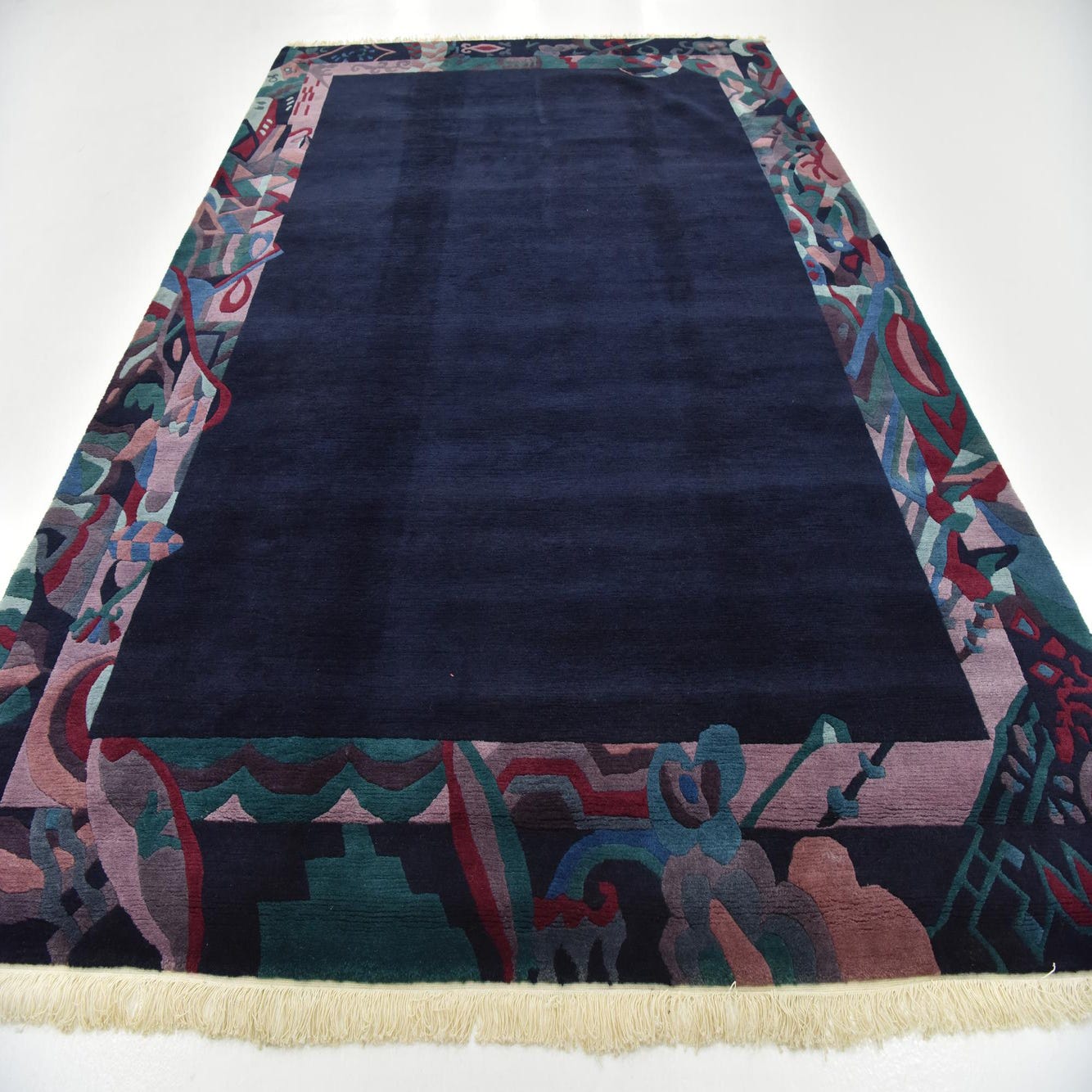 A rectangular 8x11 Rugs.com Nepal rug featuring a solid navy blue center with an abstract, multi-colored border in blues, purples, and teals.