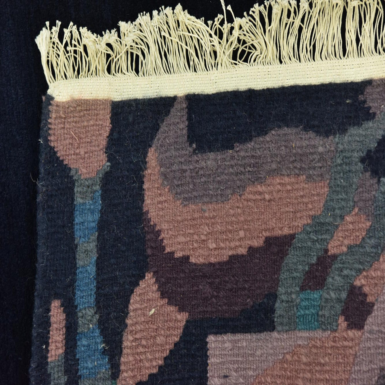 Primary color is Navy Blue. Colors in this rug include: Navy Blue, Beige, Black, Blue, Brown, Green, Puce, Purple, Red.