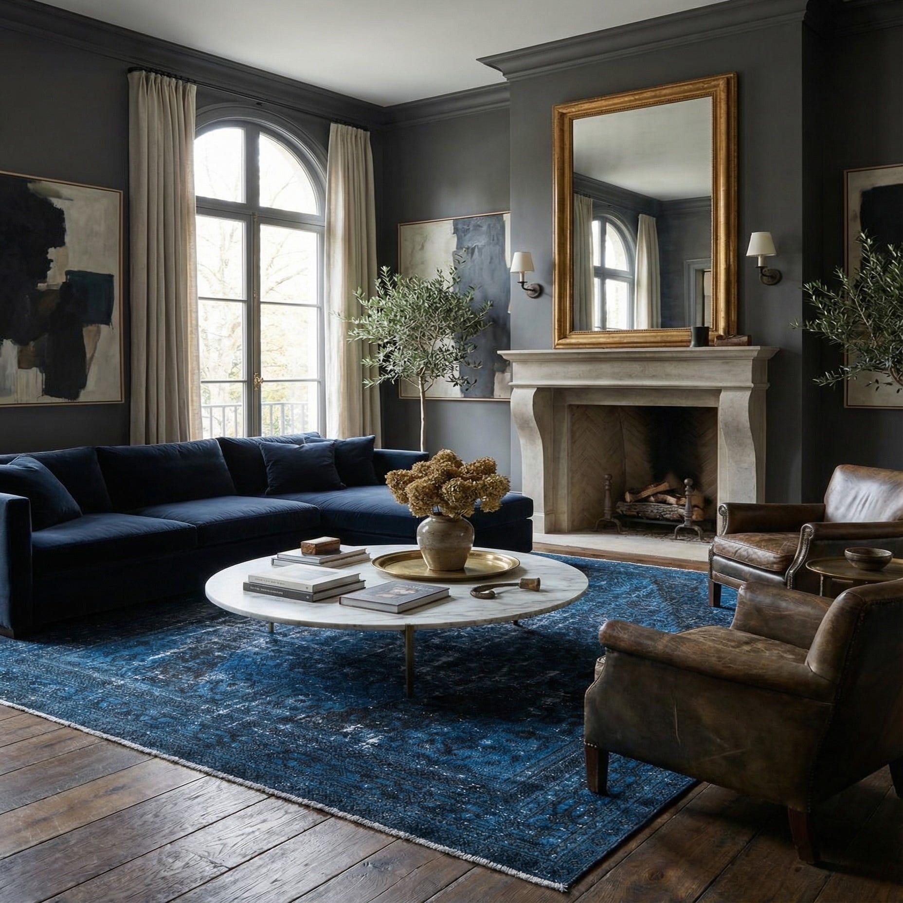 Primary color is Navy Blue. Colors in this rug include: Navy Blue, Black, Ivory.
