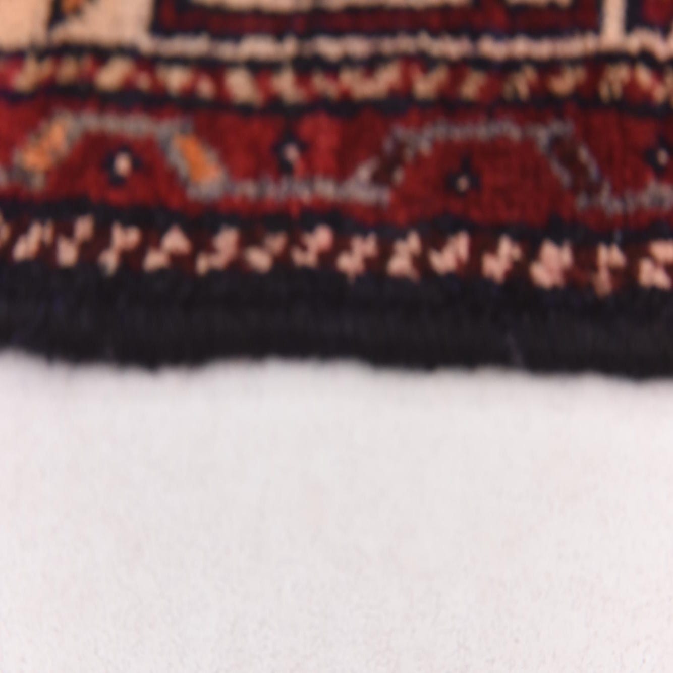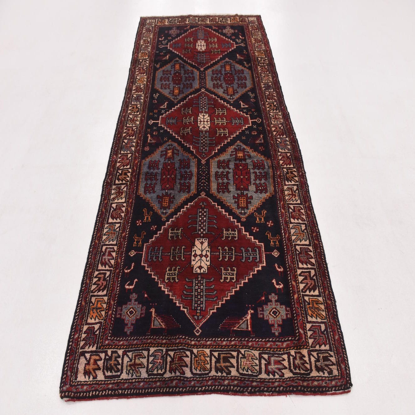 The Hamedan collection presents a hand-knotted 9 ft runner rug meticulously crafted from 100% wool. This piece showcases a robust navy blue background that lends depth and character to its traditional design. The pattern features a series of geometric motifs and stylized floral elements in a color palette that includes black, blue, orange, peach, ivory, and red accents, resulting in a vibrant yet harmonious visual appeal. The intricate borders encase the central design with precision, introducing a sense of order and continuity.