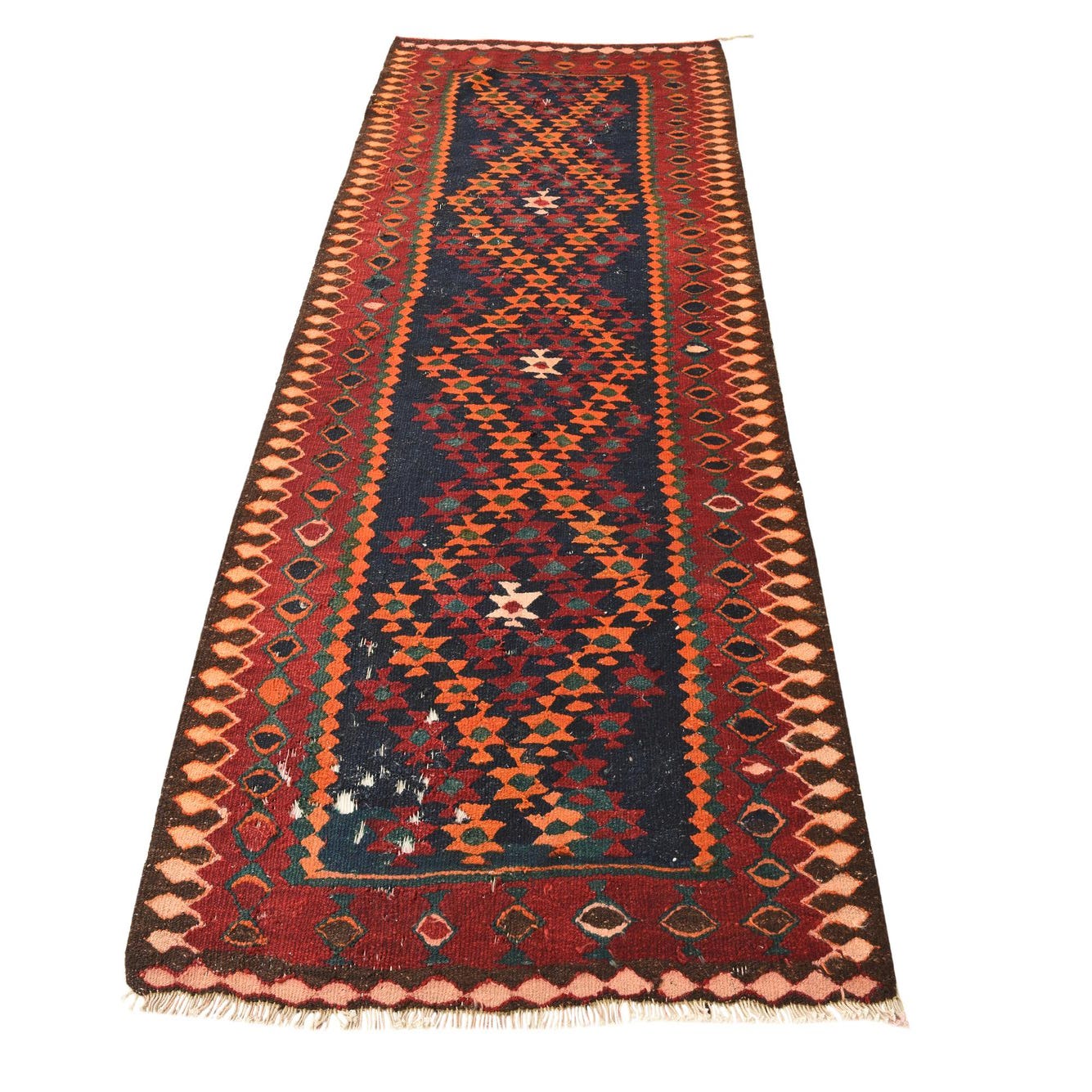 A 9 ft Kilim Fars runner rug with a navy blue center and tribal patterns in orange, red, and green, framed by a deep red border with geometric motifs.