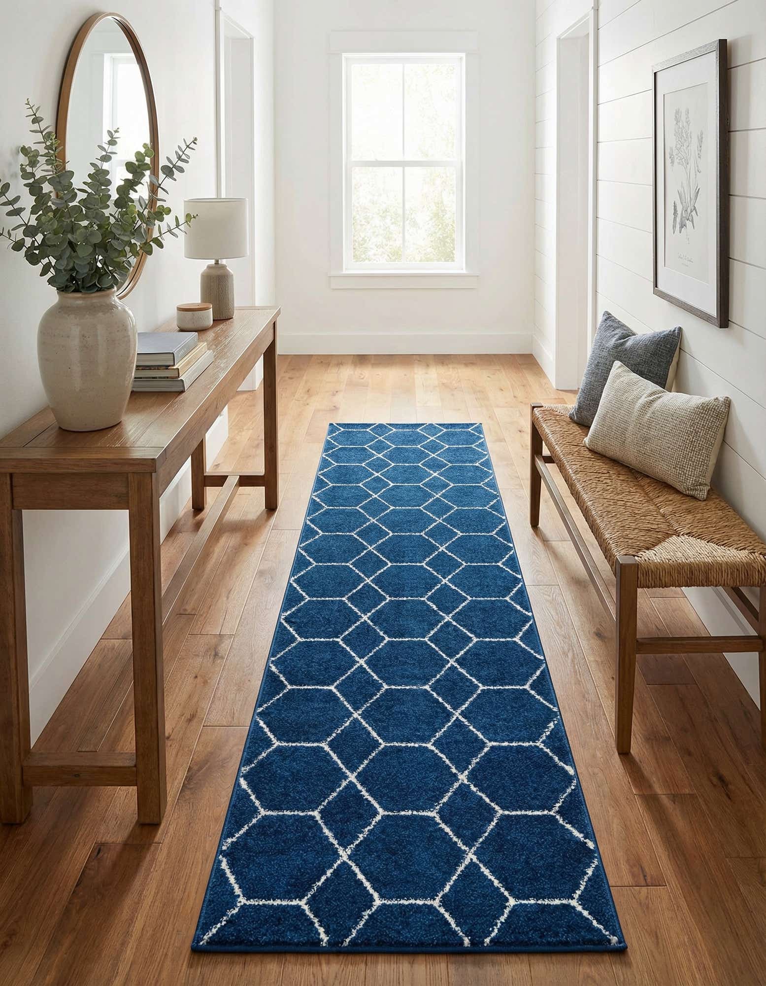 A 9 ft runner rug in a deep navy blue, featuring a modern white trellis pattern, ideal for a hallway.