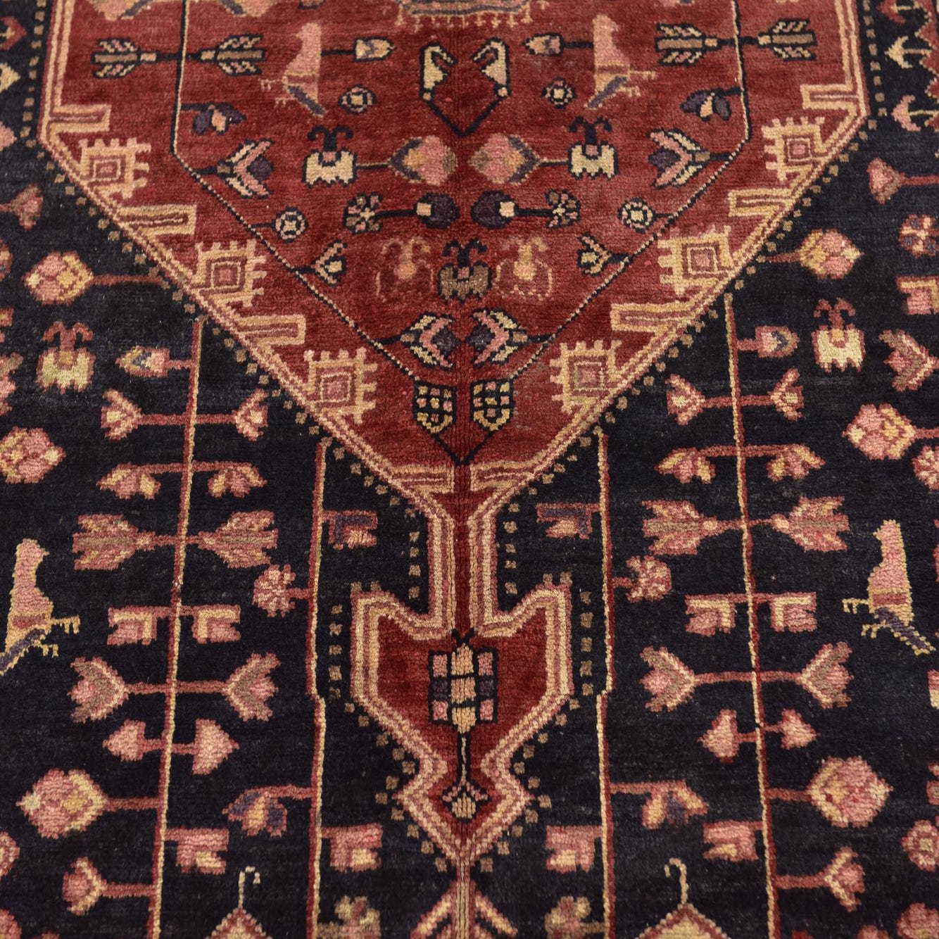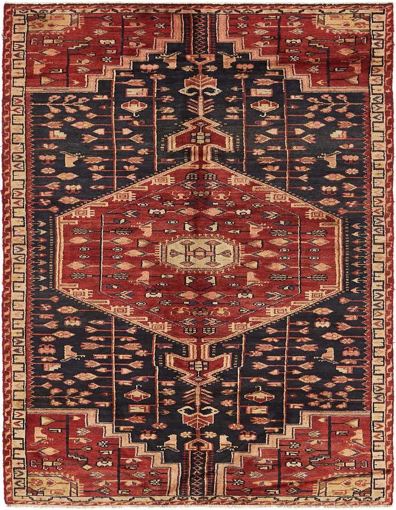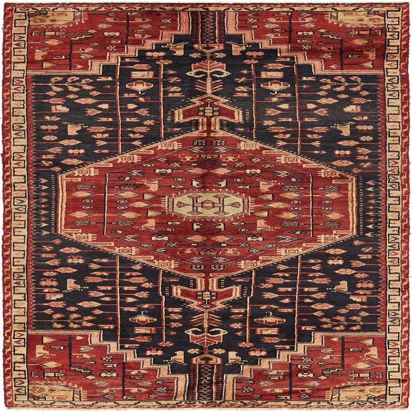 Primary color is Navy Blue. Colors in this rug include: Navy Blue, Beige, Black, Cream, Light Green, Olive, Red.