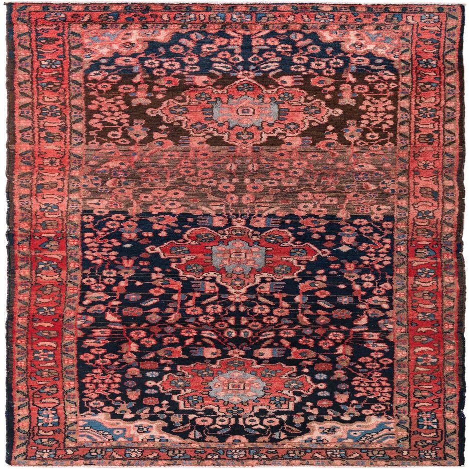 A 9 ft runner rug featuring a navy blue and dark brown field with intricate red, pink, and light blue Persian medallion and floral patterns, framed by a red border.