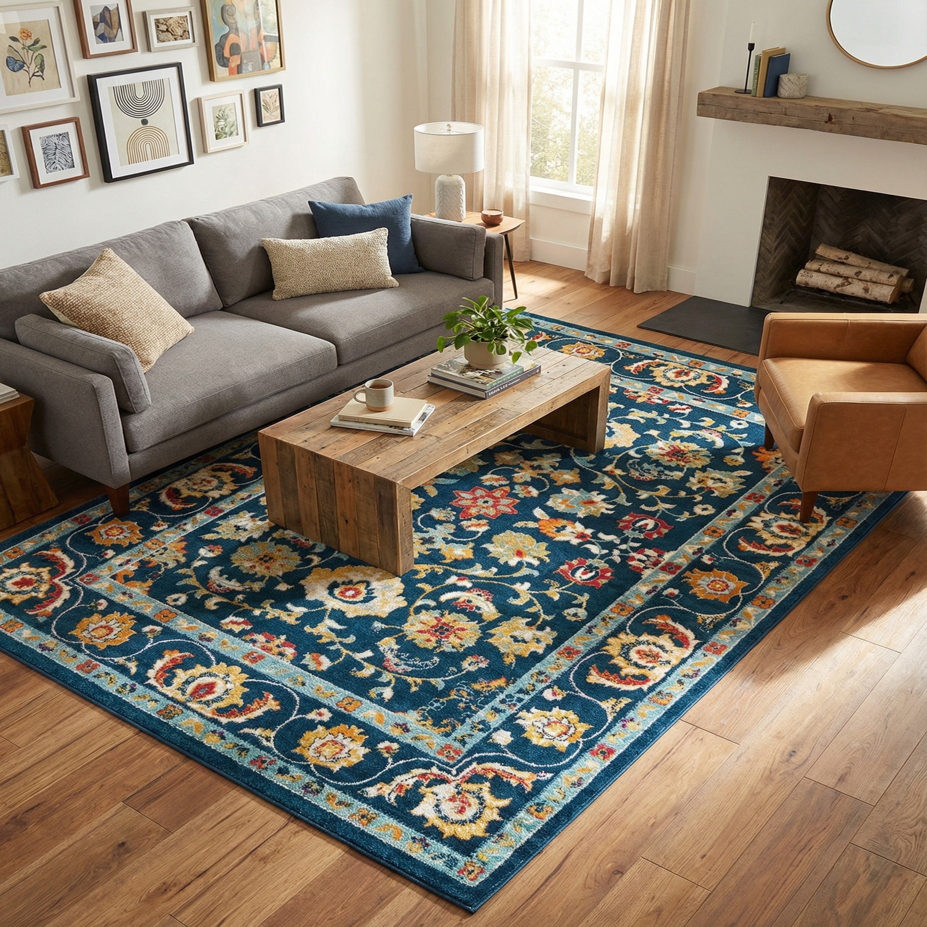 This rug works well as the anchor for a living room seating group or beneath a dining table, where the strong navy ground and colorful highlights bring warmth and visual interest. Pair it with warm wood furniture and neutral upholstery for a traditional or transitional look, or use bright accent pillows and light blue drapery to emphasize its modern, eclectic side. Its durable construction makes it suitable for everyday areas like family rooms or home offices while the color palette also complements coastal or cottage-inspired interiors.