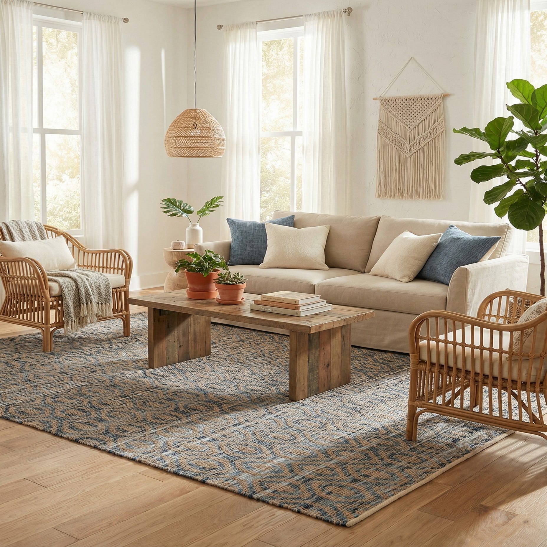 This piece complements casual and transitional interiors alike — try it under a seating group in a relaxed living room, beneath a dining table to ground the space, or in a sunlit den with light wood and rattan accents. Pair with linen upholstery, natural wood tones, and brass or matte-black metal finishes for a balanced mix of warmth and structure. The woven construction offers a sturdy, everyday surface that works well in high-traffic rooms where style and texture matter.