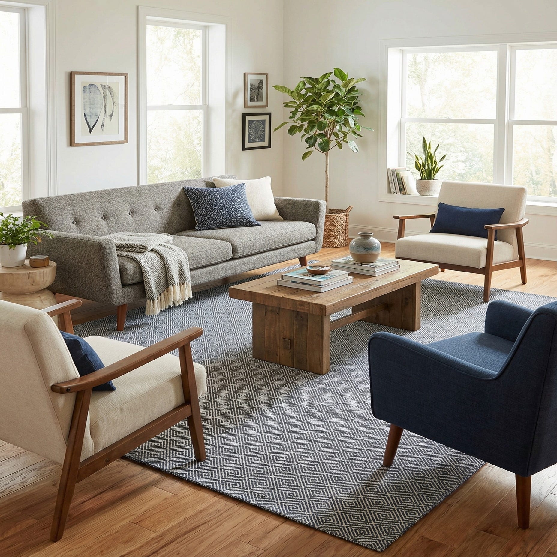 A 9x12 rectangular navy blue and white flatweave rug with a repeating contemporary trellis diamond pattern, ideal for a living room.
