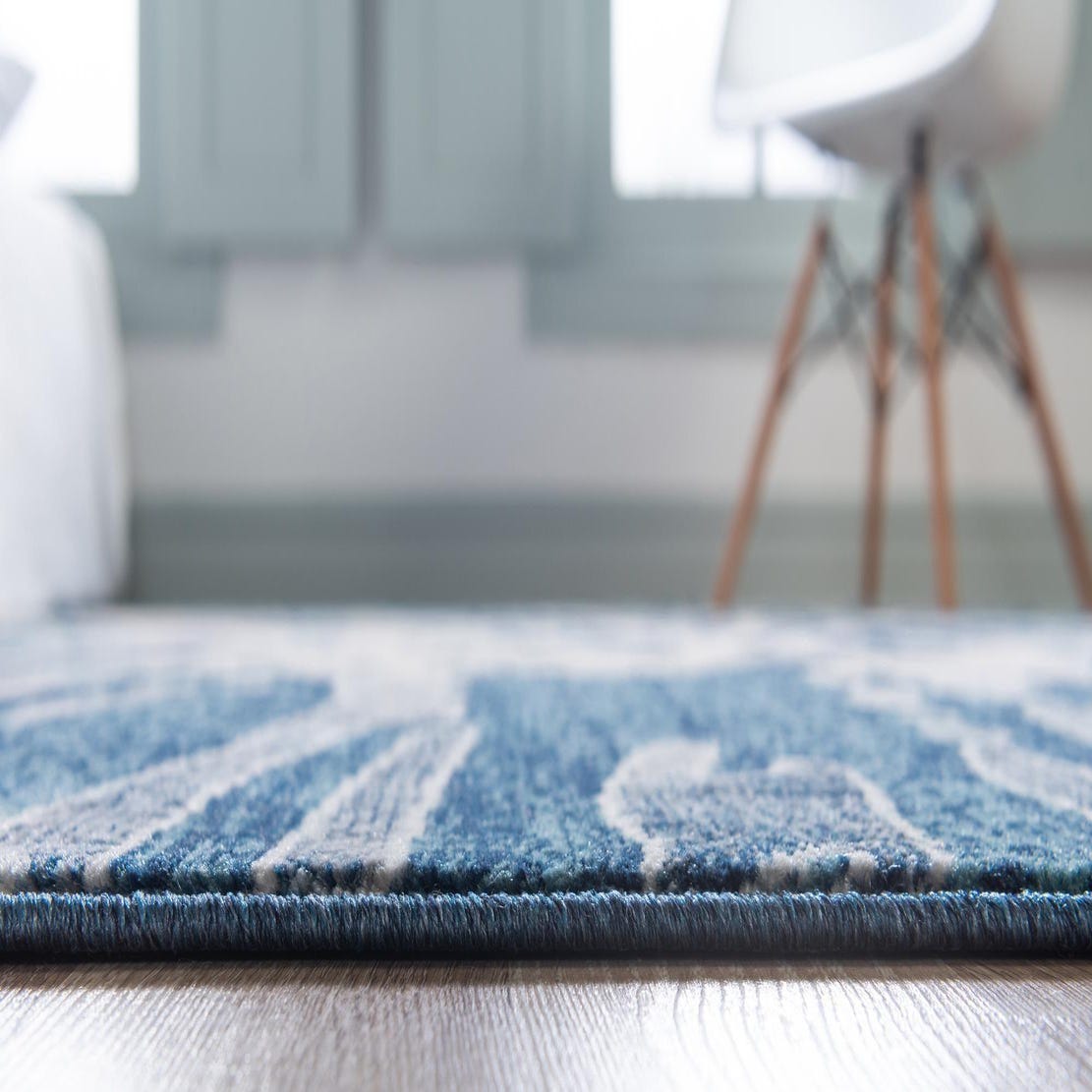 Primary color is Navy Blue. Colors in this rug include: Navy Blue, Beige, Light Blue, Tan.