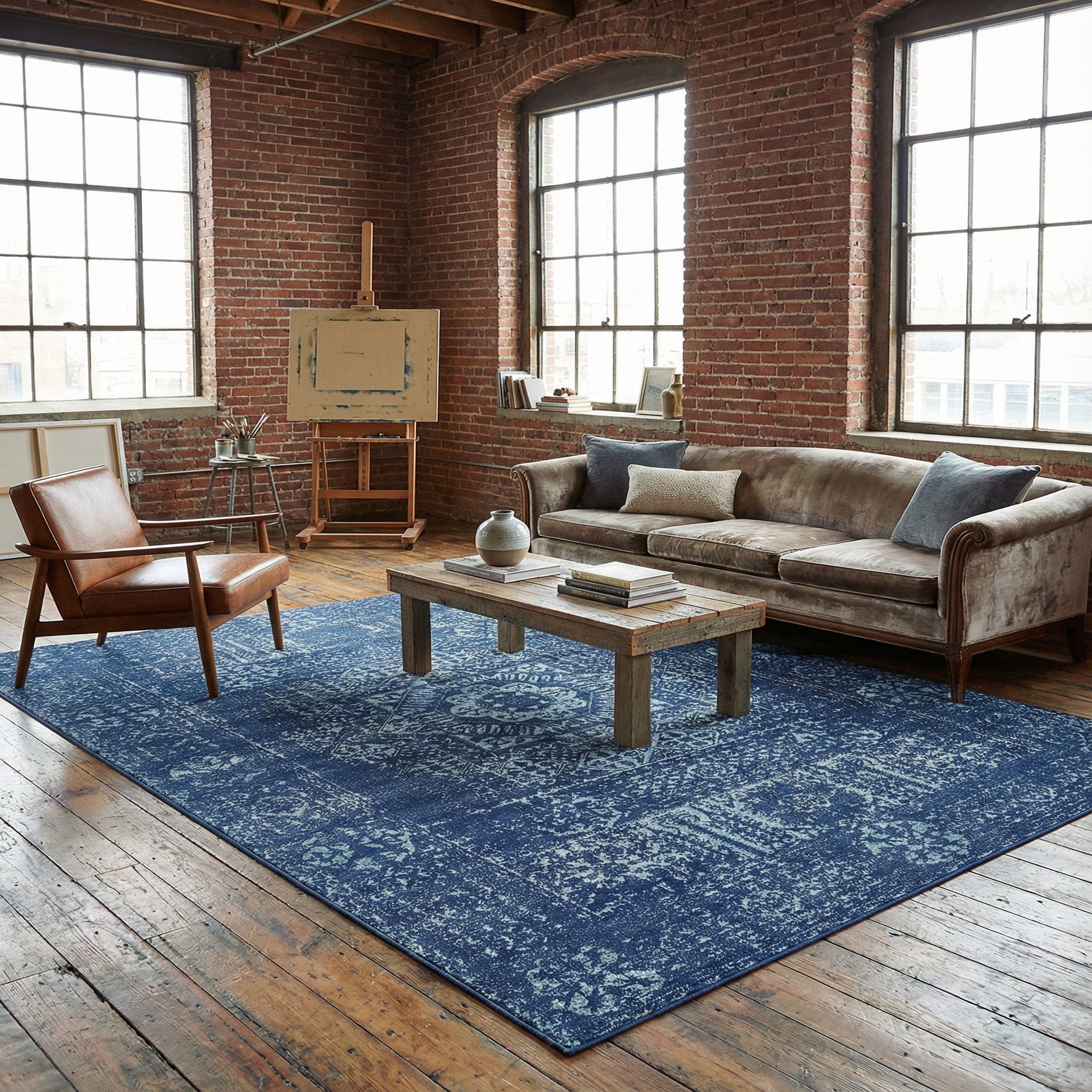 Primary color is Navy Blue. Colors in this rug include: Navy Blue, Blue, Ivory.
