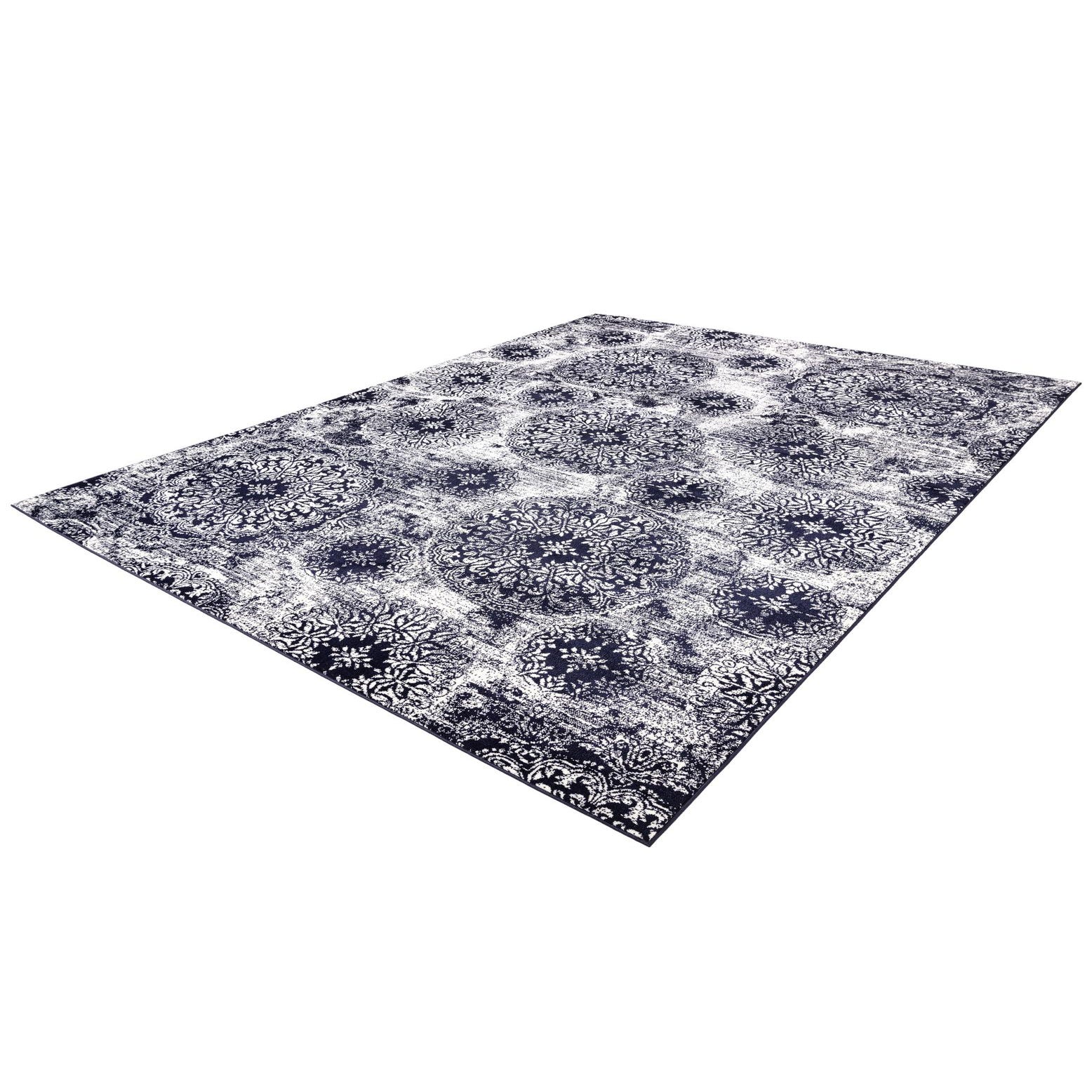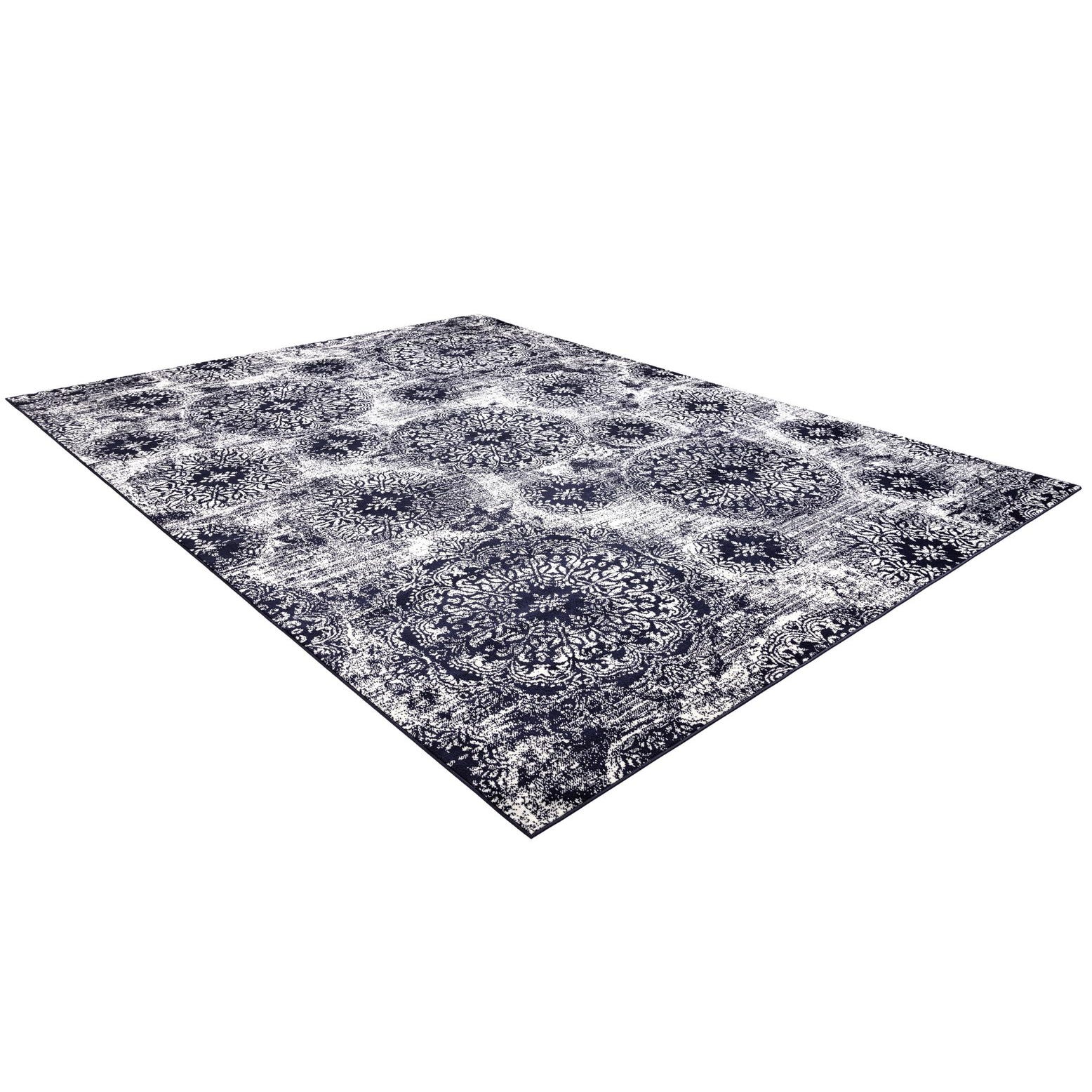 The Monte Carlo collection rug is an exemplar of durability and style, meticulously machine-woven from 100% polypropylene. This 9x12 area rug showcases a striking navy blue background with a complementary ivory pattern, delivering an elegant visual contrast that commands attention. The design features a blend of traditional and transitional motifs, offering a versatile appeal that gracefully bridges classic and contemporary aesthetics.