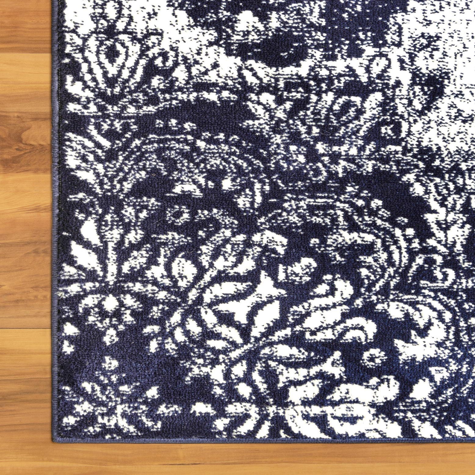 The textured surface provides a tactile dimension to the piece, while its consistent navy and ivory palette ensures that it remains the focal point in any room. The material not only provides a soft underfoot but also boasts practical stain-resistant properties, complementing busy living spaces where luxury and functionality are paramount.