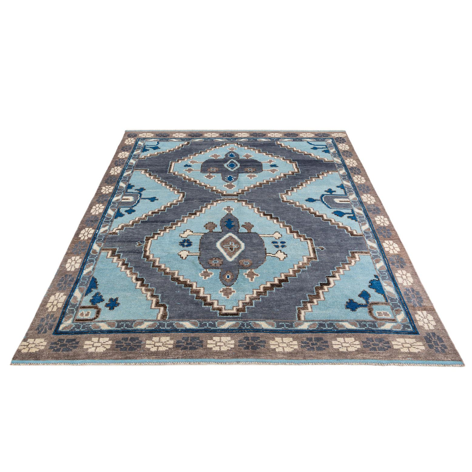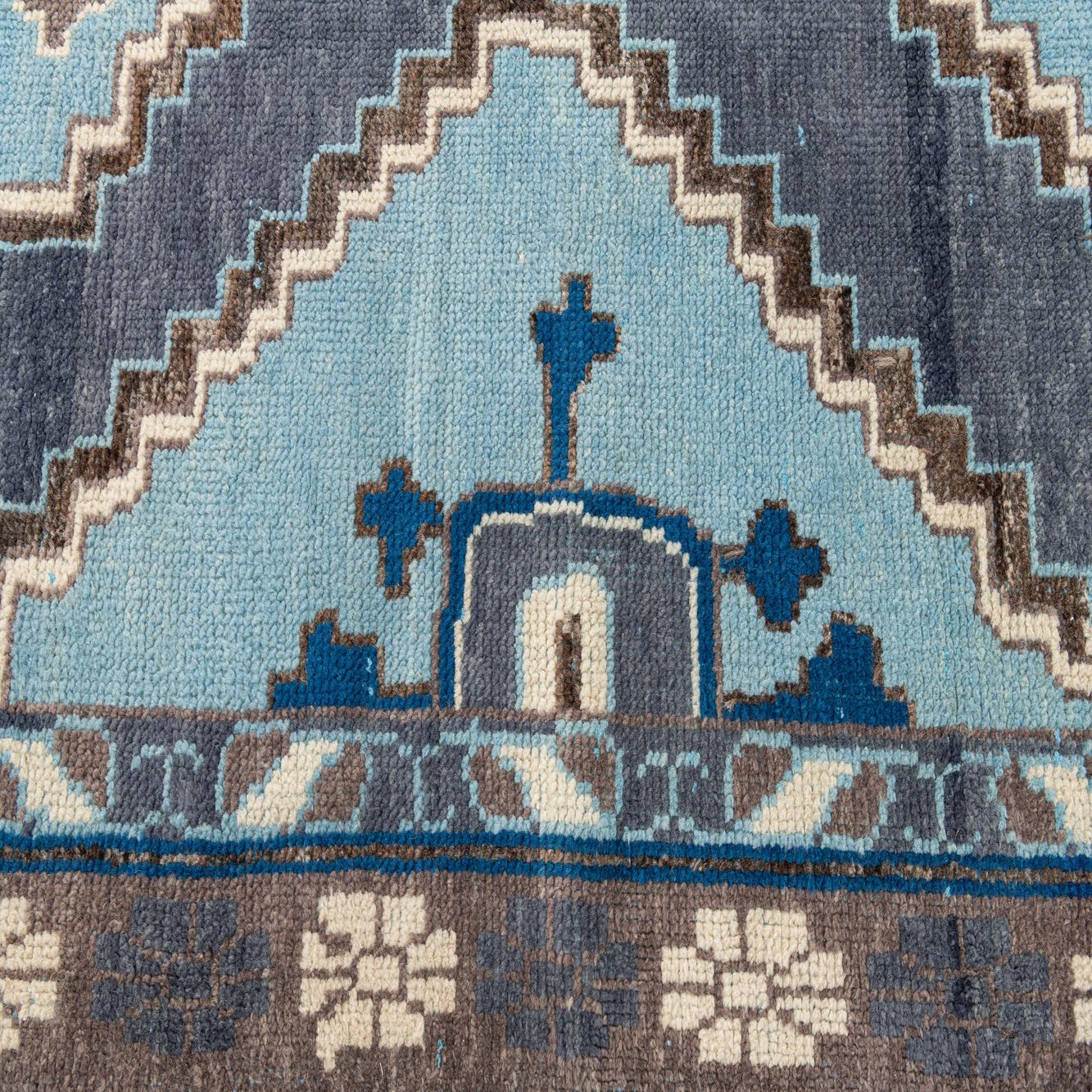 A 9x12 rectangular Moroccan shag rug with a tribal medallion pattern in varying shades of blue, brown, and cream.