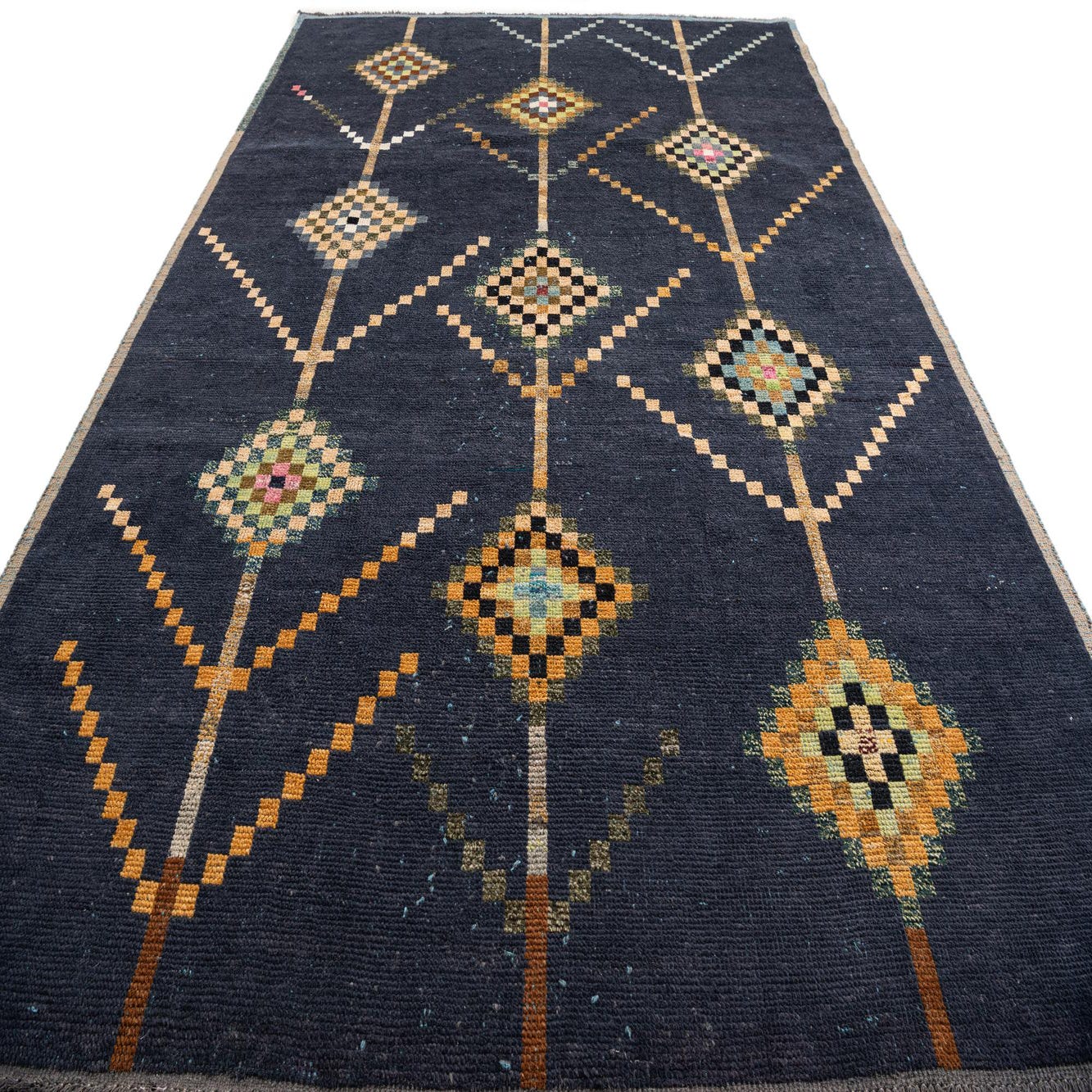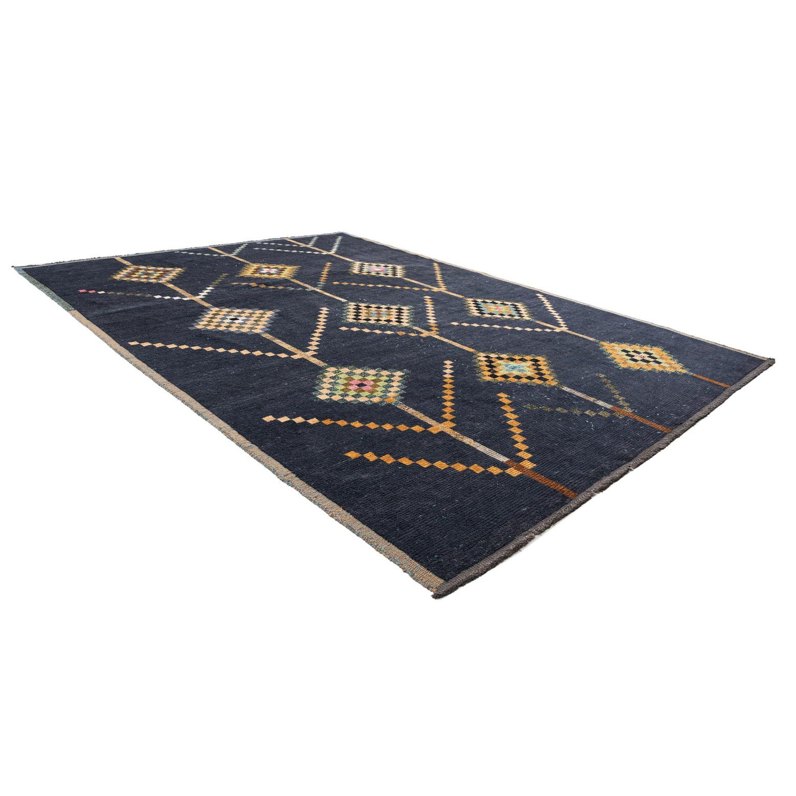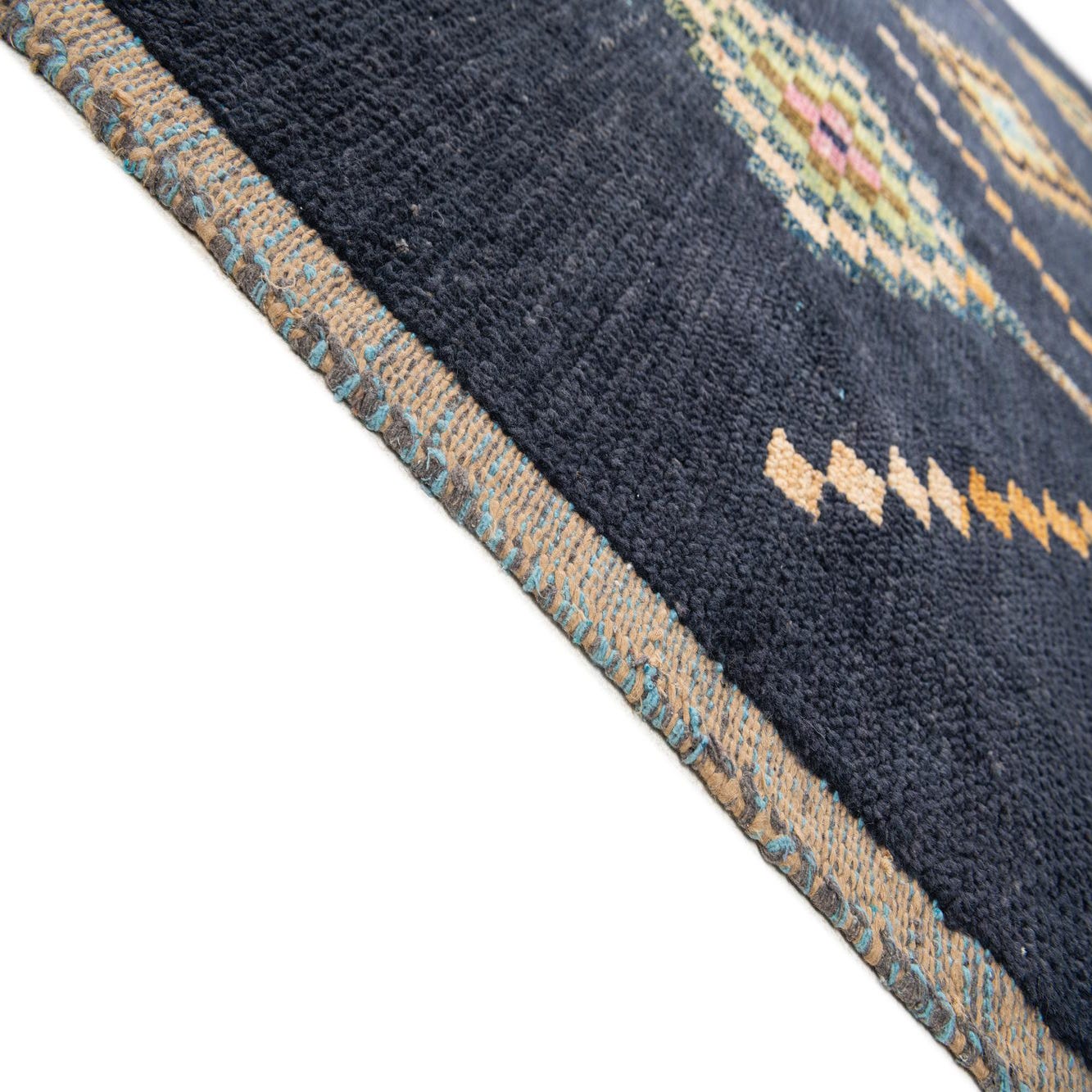 Primary color is Navy Blue. Colors in this rug include: Navy Blue, Black, Brown, Gray, Light Green, Pink.