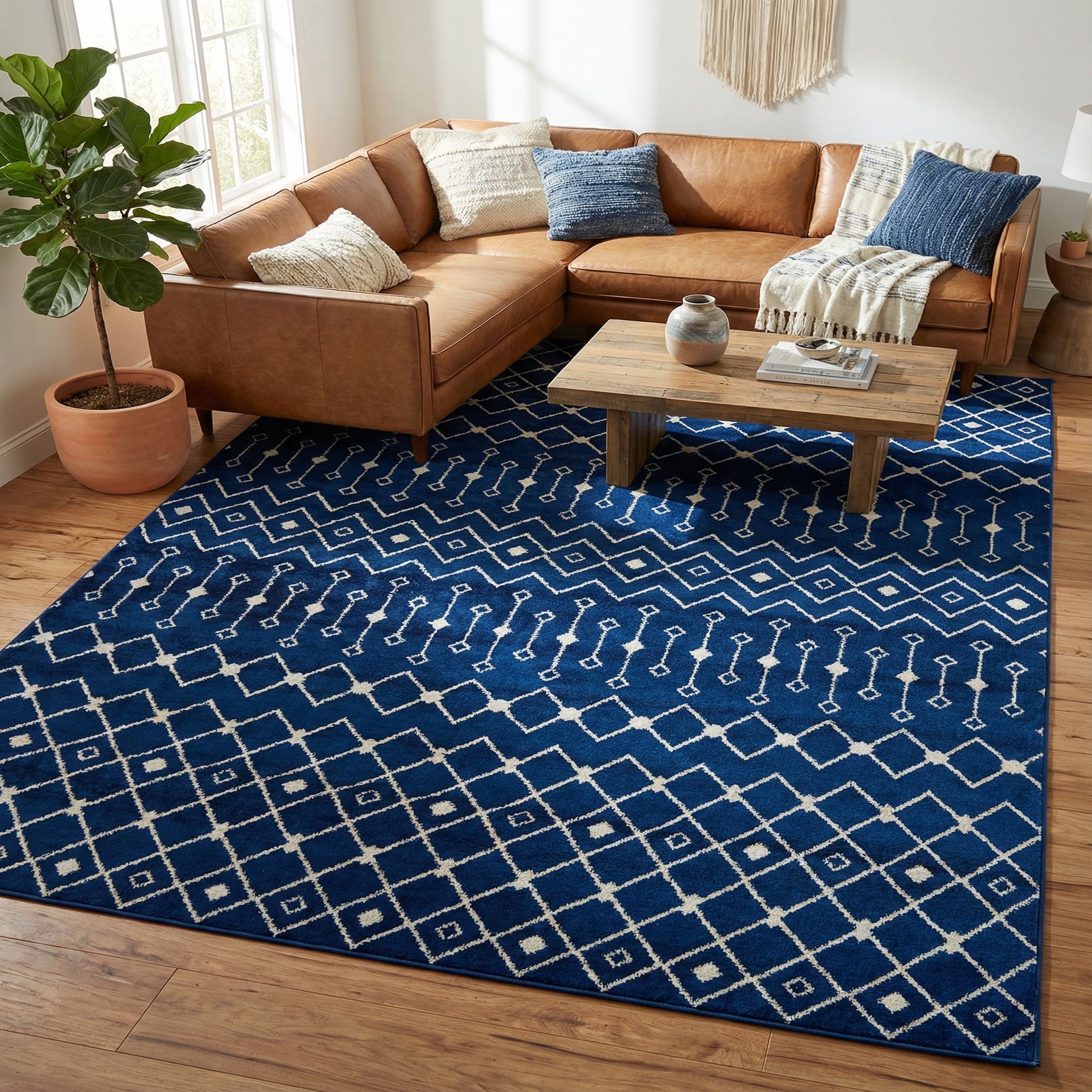 Machine-made from polypropylene, the rug has a low, dense pile that feels smooth and slightly cushioned underfoot, with enough texture to read clearly without overwhelming a room. The fiber finish enhances the navy’s depth and keeps the ivory pattern defined. Place it under a seating group to ground a living room, beneath a dining table to add graphic interest to a neutral floor, or layer it in a home office for a crisp foundation that pairs well with light woods, brass accents, and linen upholstery.