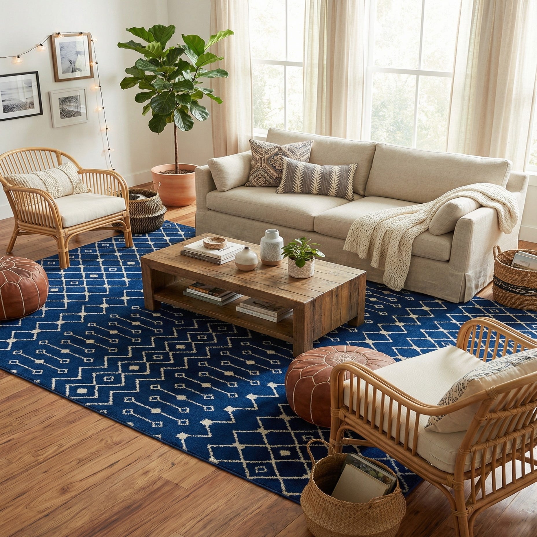 Machine-made from polypropylene, the rug has a low, dense pile that feels smooth and slightly cushioned underfoot, with enough texture to read clearly without overwhelming a room. The fiber finish enhances the navy’s depth and keeps the ivory pattern defined. Place it under a seating group to ground a living room, beneath a dining table to add graphic interest to a neutral floor, or layer it in a home office for a crisp foundation that pairs well with light woods, brass accents, and linen upholstery.