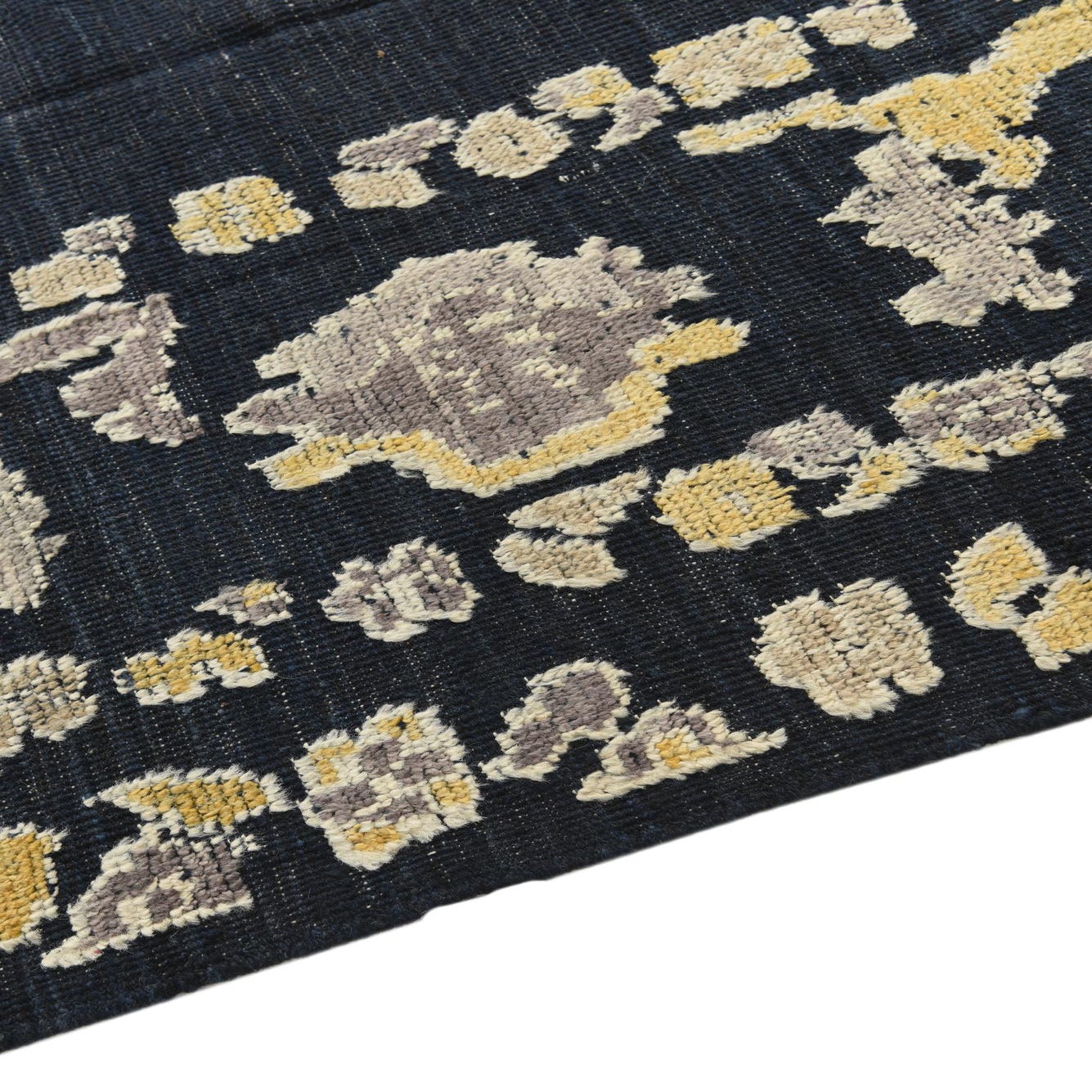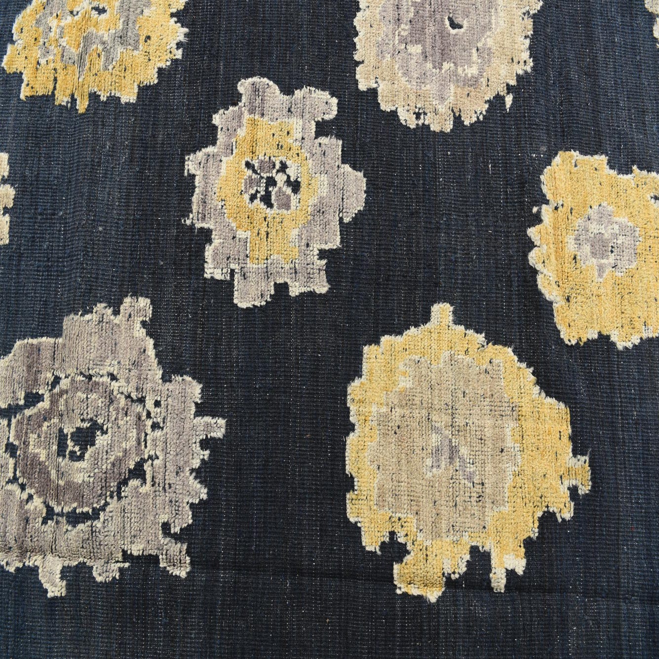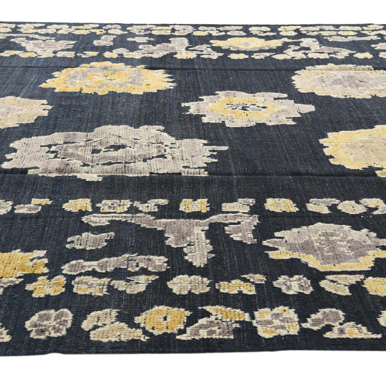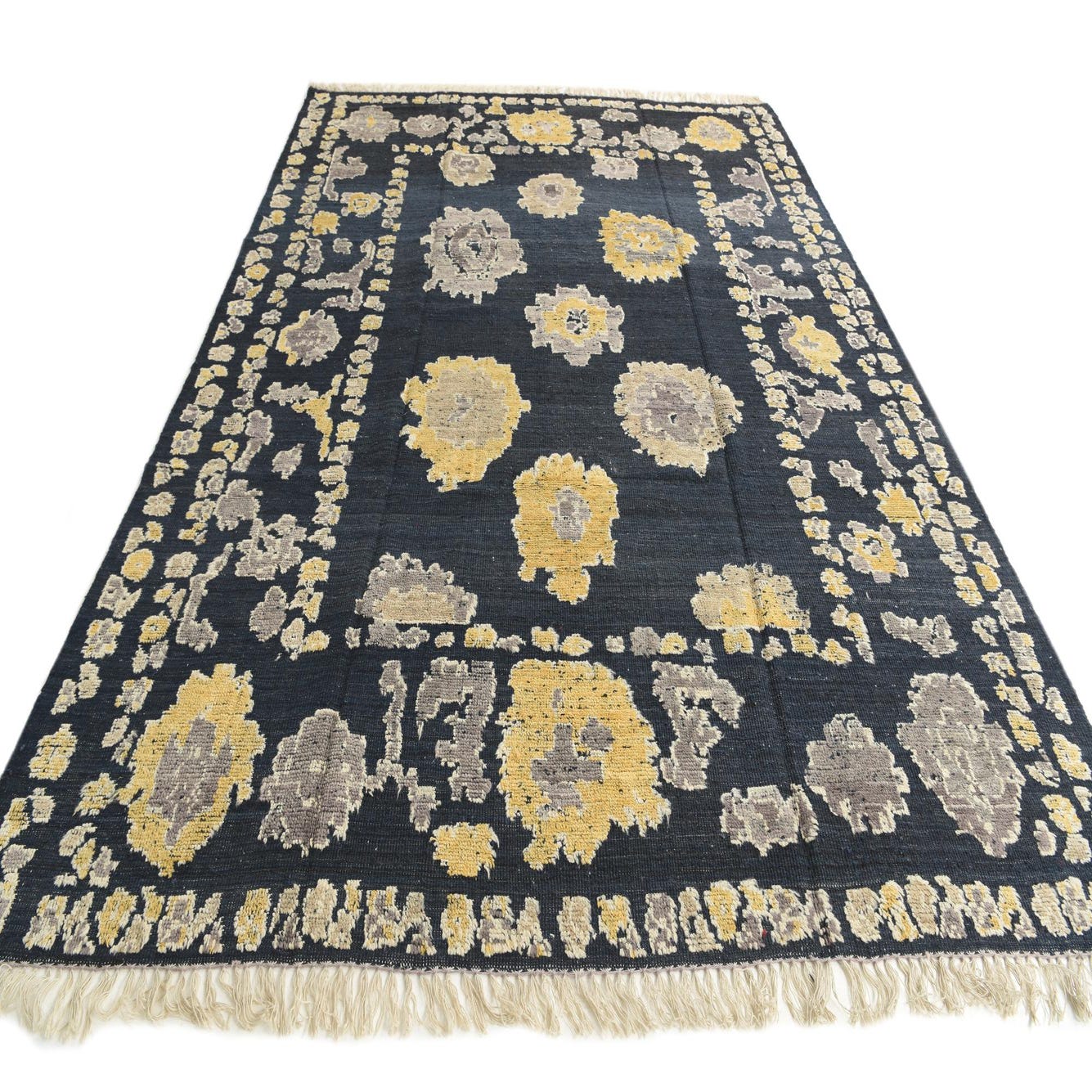 A 9x12 rectangular Oushak rug with a modern floral pattern in navy blue, yellow, and grey, featuring fringe.