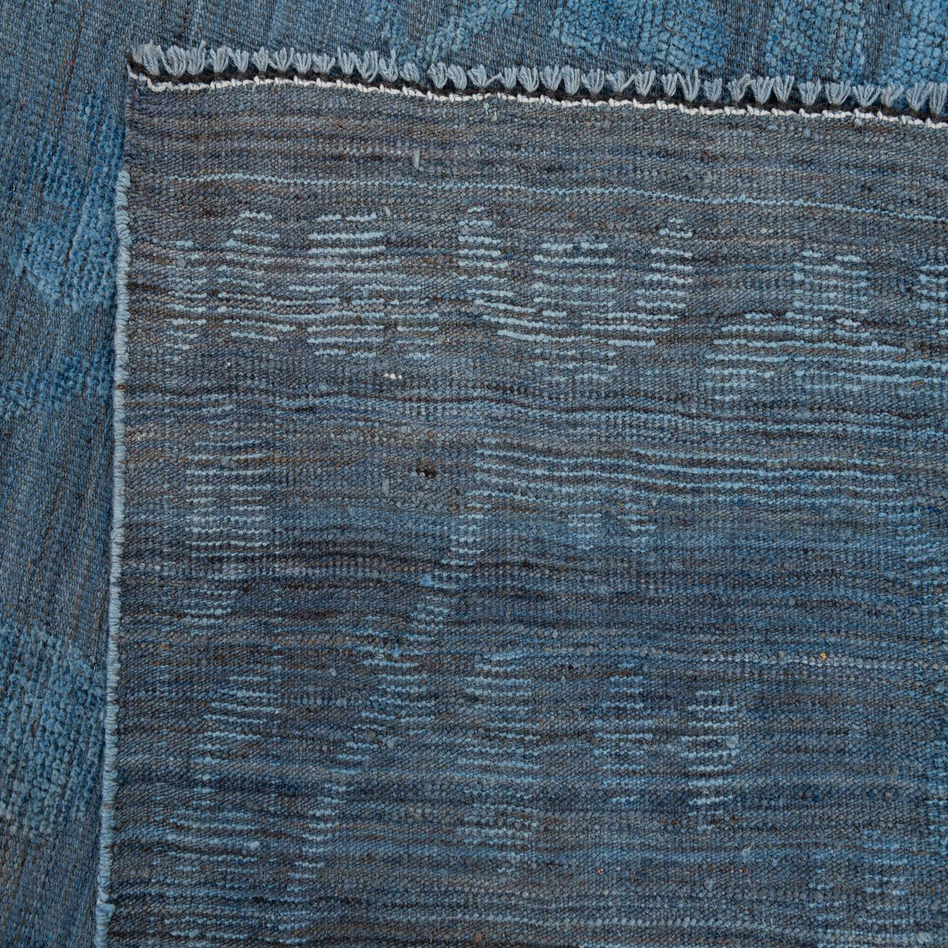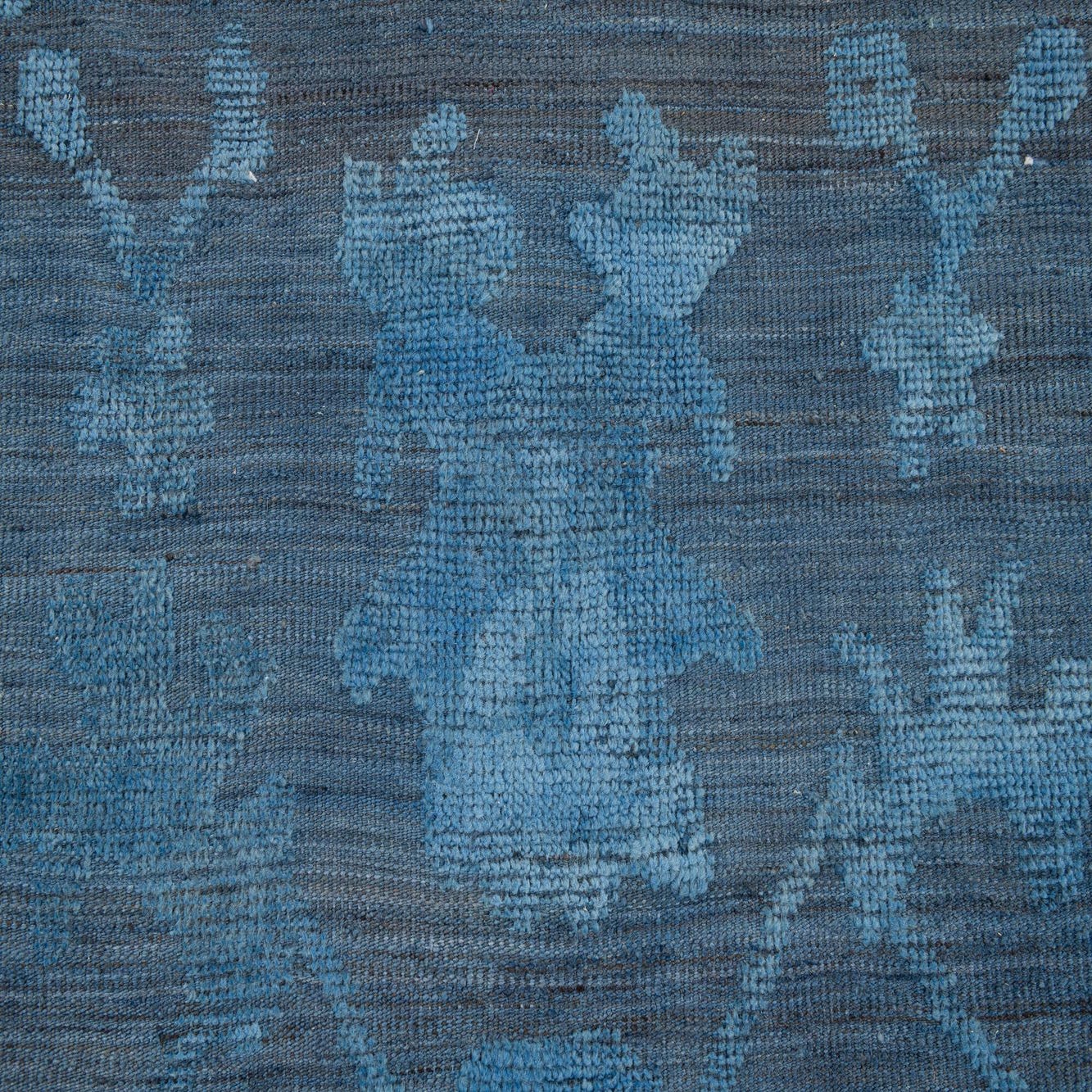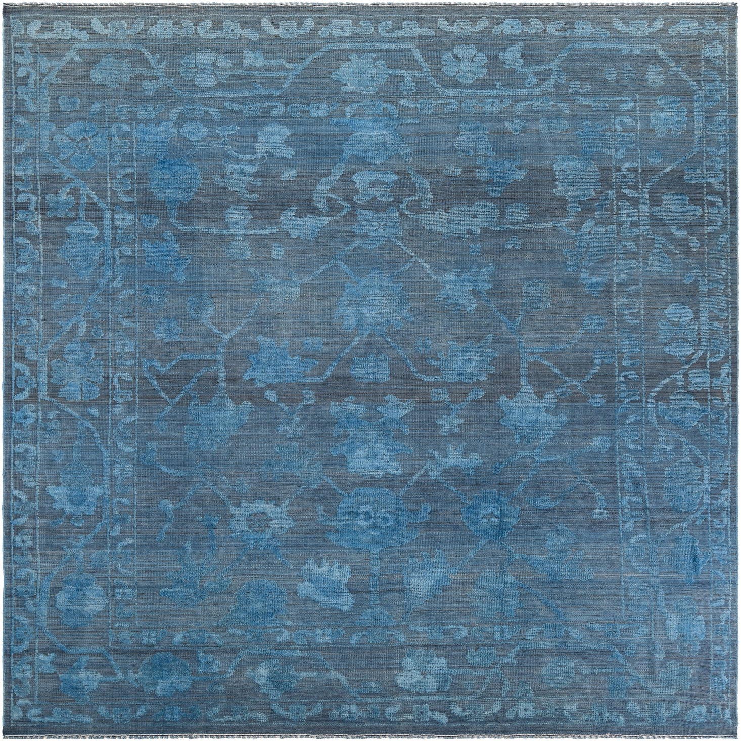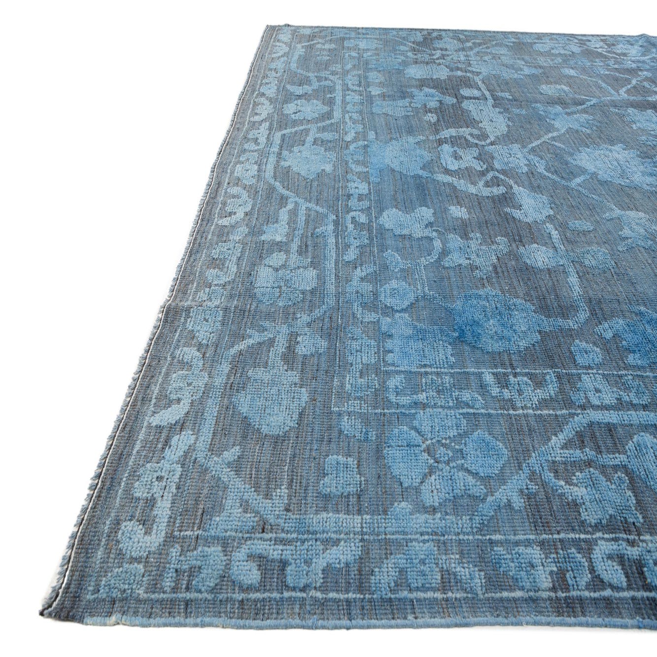 A 9x12 rectangular Oushak rug in varying shades of blue, featuring a modern floral pattern with a distinct border.