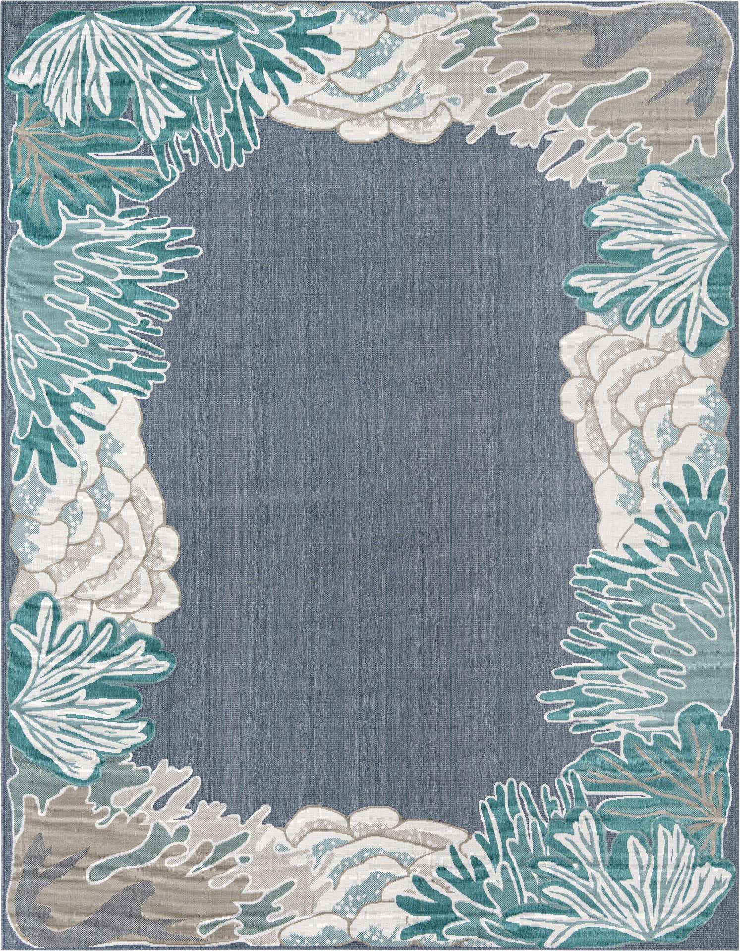 This 9x12 rug from the Outdoor Coastal collection showcases a striking balance of color and design that would enhance any outdoor living space. The machine-woven 100% polypropylene composition ensures durability and ease of maintenance. The pattern features stylized coral motifs in tones of ivory and green, gracefully positioned against a deep navy blue background that lends itself to a nautical theme. Accents of gray and beige add depth and versatility to the overall design.