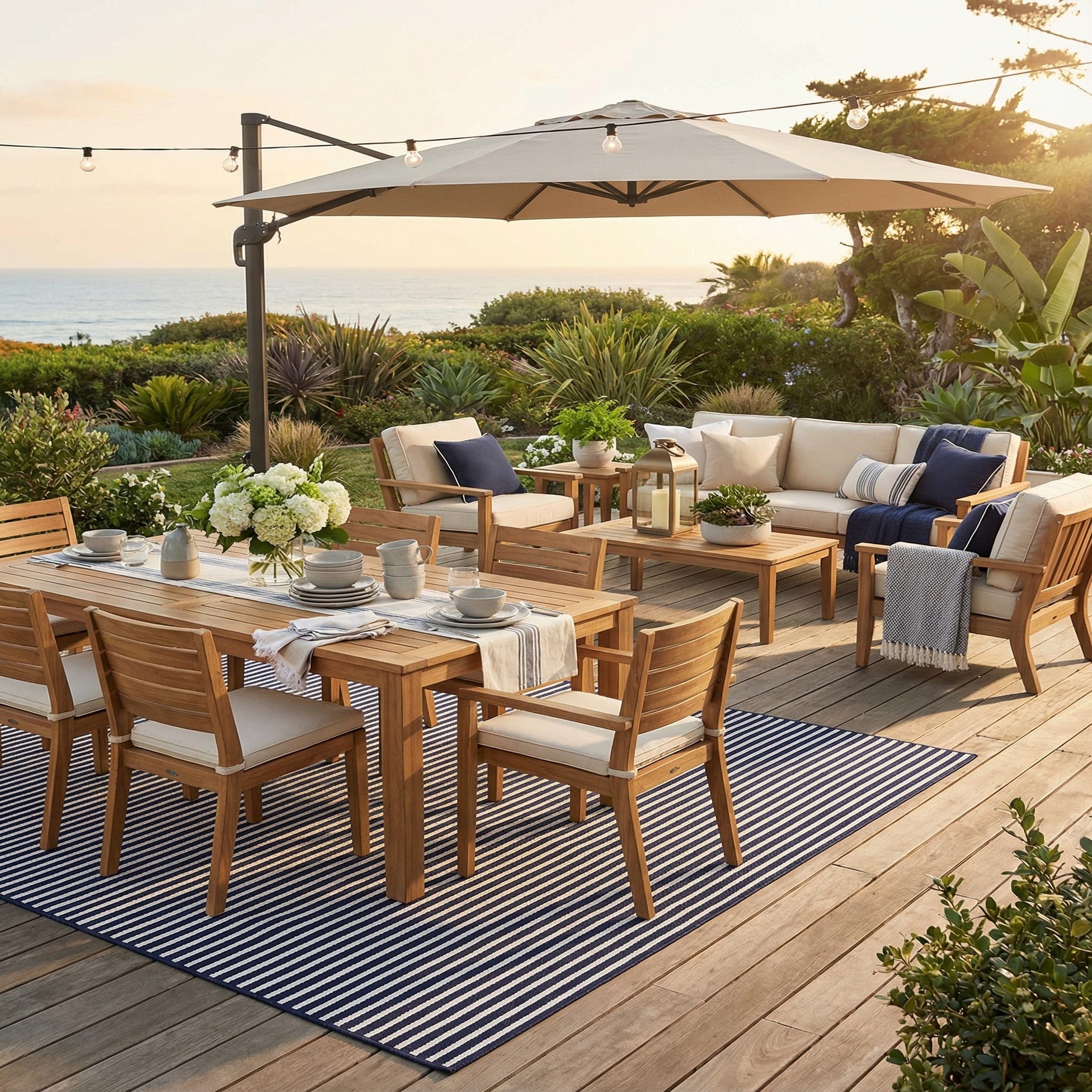 This rug works well anywhere you want a fresh, tailored foundation: place it on a covered patio or porch, layer it in a sunroom, or use it to anchor a casual living or dining area. Pair it with natural woods, white-painted furniture, and brass or matte-black accents for a contemporary coastal scheme, or combine it with linen textiles and navy throw pillows for a crisp, nautical-inspired room.