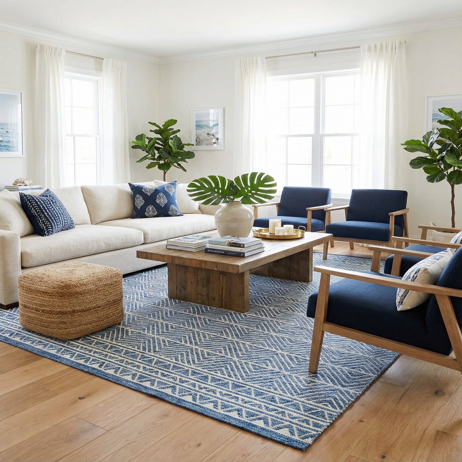 This rug works well on a covered patio or sunroom where you want a smart, graphic anchor that can handle high-traffic zones. Indoors, place it under a coffee table in a navy-and-white living room, beneath an outdoor dining set on a screened porch, or layered with natural-fiber rugs in a casual coastal or modern farmhouse scheme. The color palette pairs easily with light woods, white linens, and brushed metal accents, bringing a confident, pared-back pattern to both indoor and outdoor living spaces.