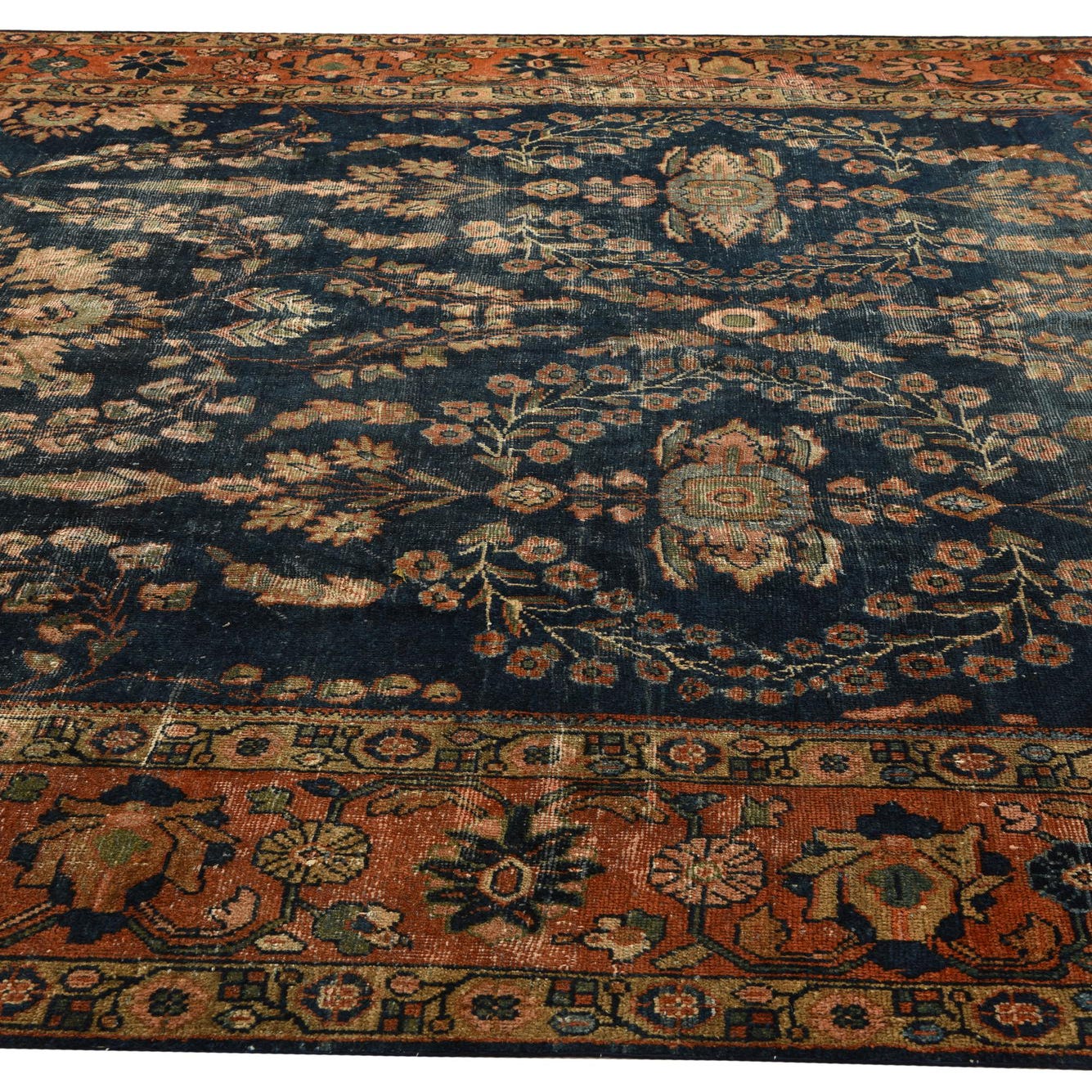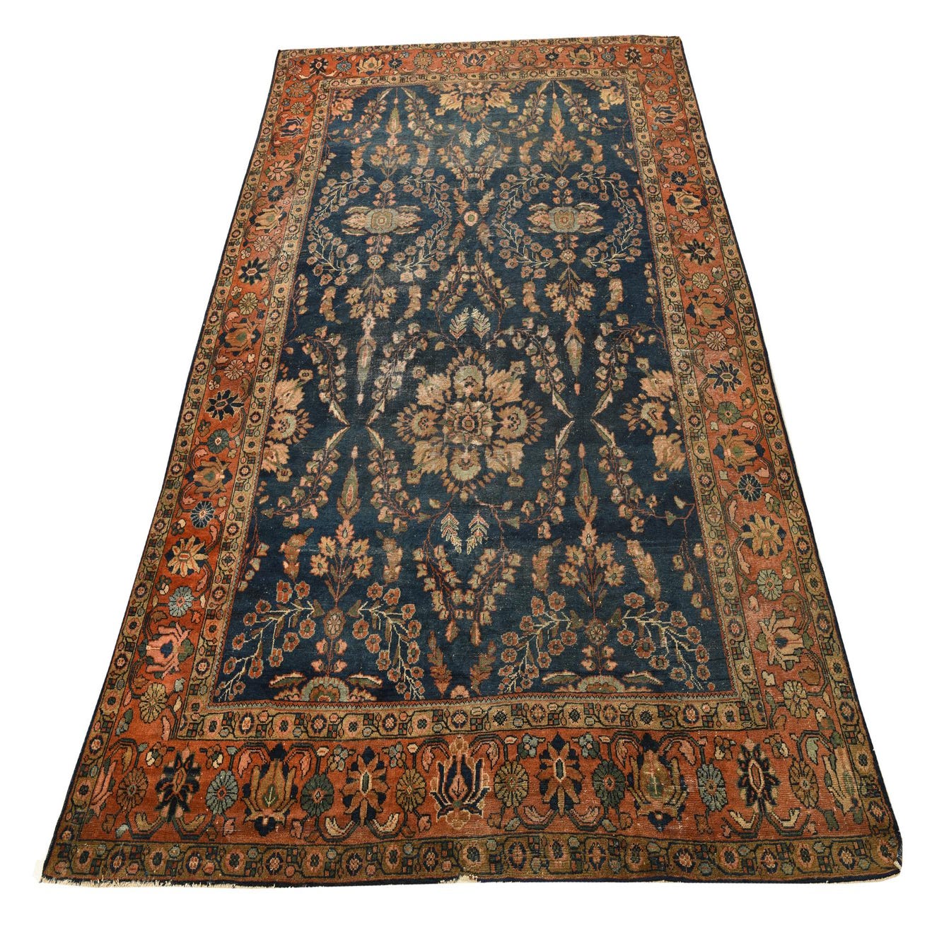 A 9x12 rectangular Sarough rug featuring a navy blue field with intricate botanical patterns and a rust-orange border.