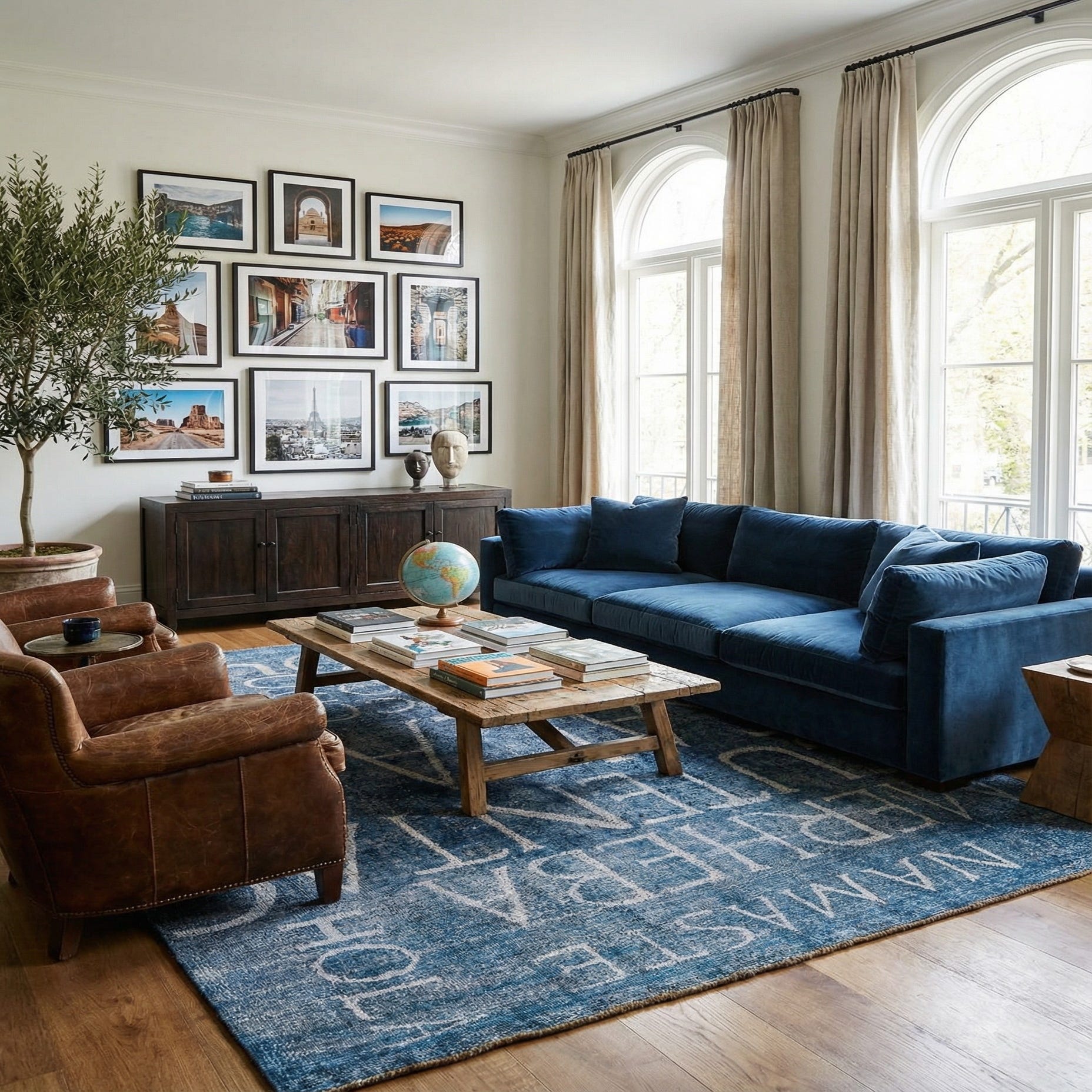 A 9x12 rectangular navy blue wool rug featuring the word "HELLO" in various languages in white, distressed text.