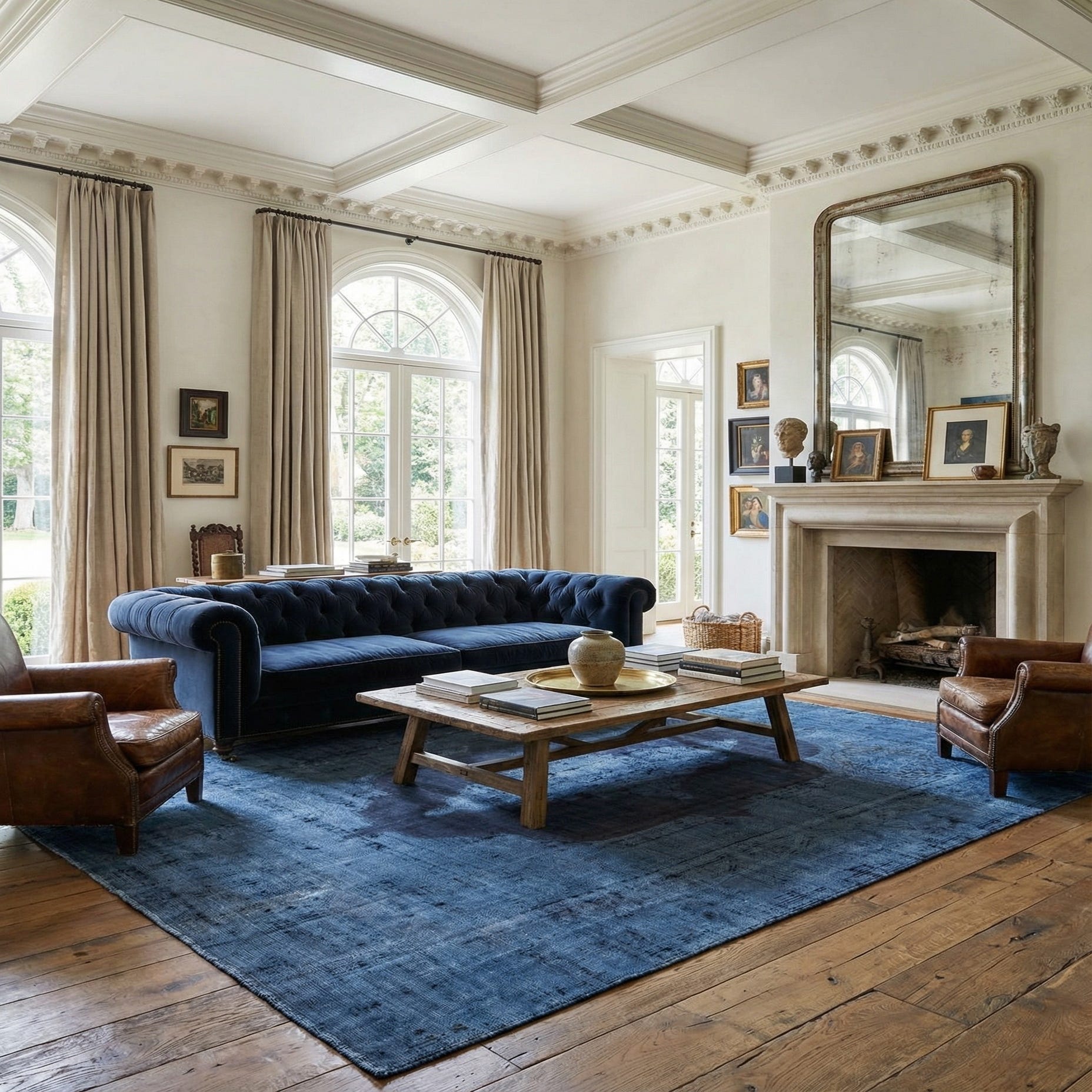 A 9x12 rectangular Ultra Vintage rug in deep navy blue with a faded Persian medallion design.