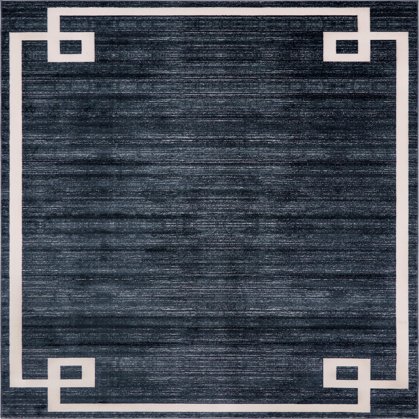 A deep navy field with subtle, horizontal striation gives this rug a layered, textile-like depth while a crisp ivory double-line border and squared Greek key corner motifs bring architectural clarity to the design. The contrast between the rich navy background and the clean ivory accents creates a modern, transitional look that balances formal structure with a relaxed, contemporary feel.