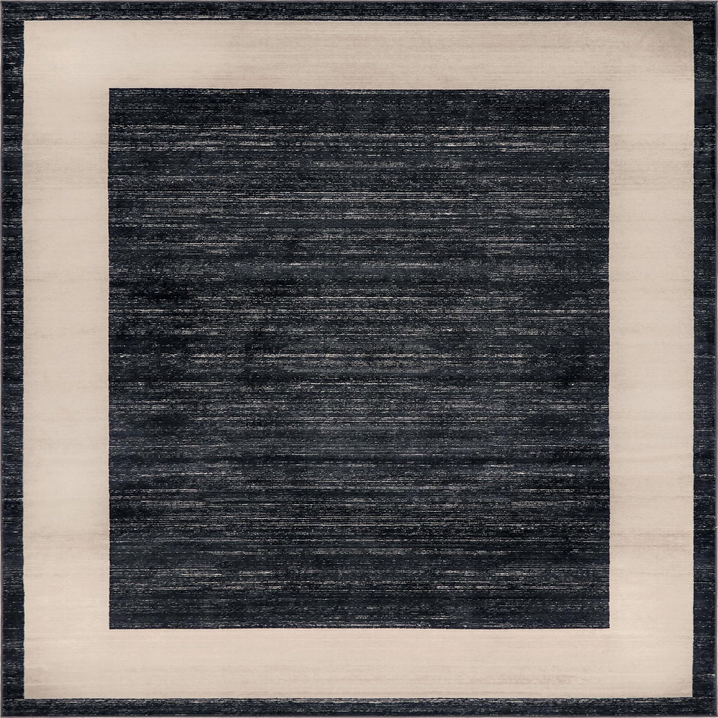 A clean, contemporary border rug in a deep navy blue background with a wide ivory band and a narrow navy outer edge. The center field shows fine, horizontal striations in varying tones of navy that add subtle visual texture without a busy pattern. The overall look is modern and restrained, with a flat, low-profile surface that lays smooth under furniture.