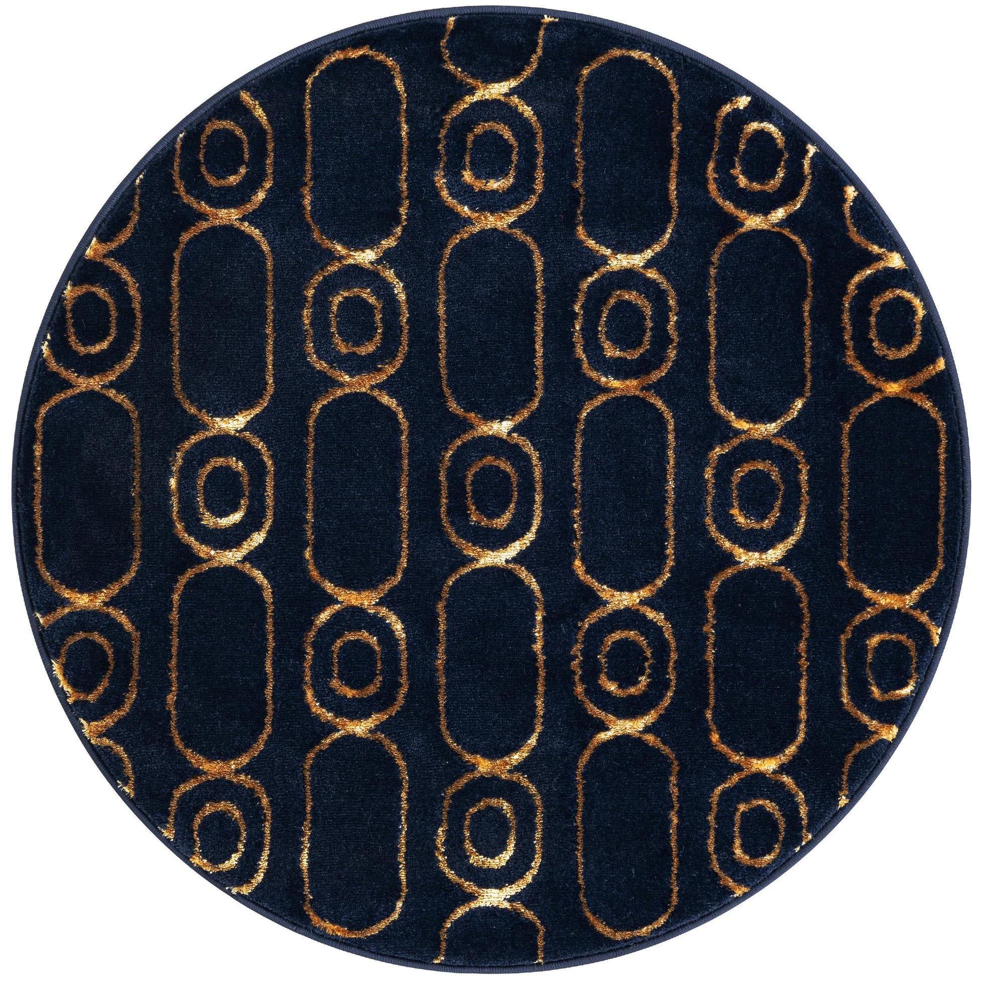 A 3' round navy blue rug with a repeating gold geometric chain-link pattern, ideal for a patio or indoor space.