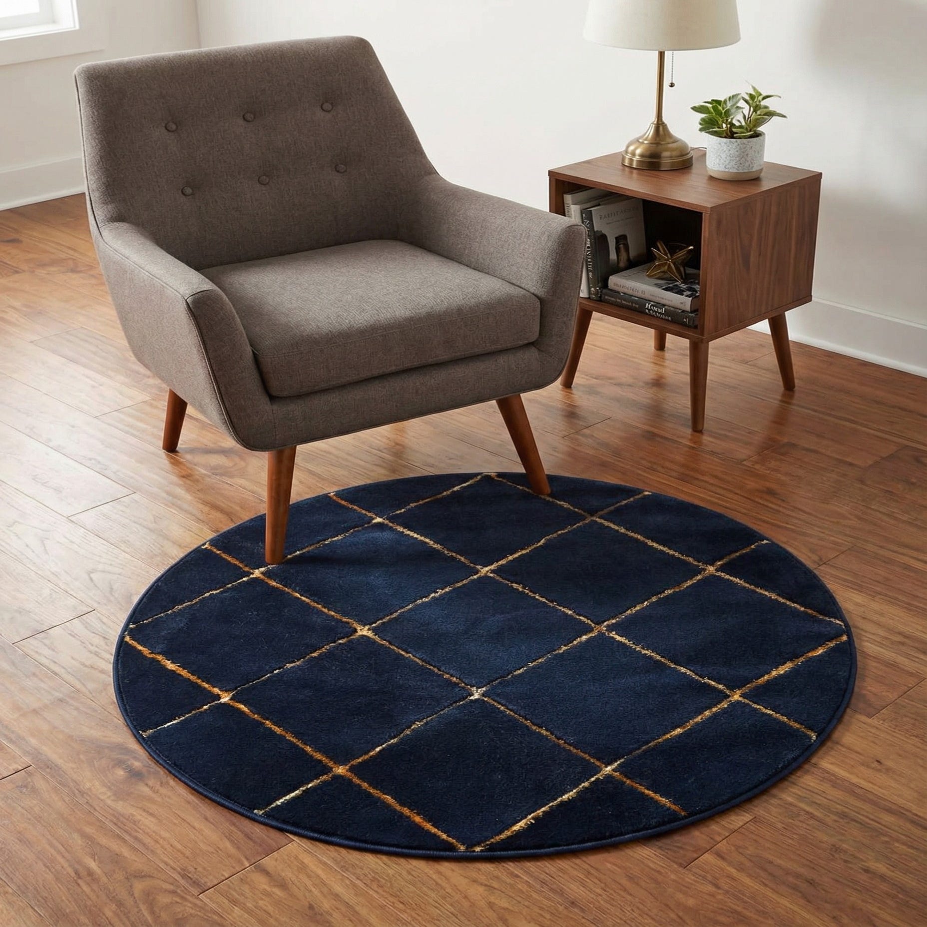 A round navy blue rug with a gold diamond lattice pattern, featuring a medium, textured pile.