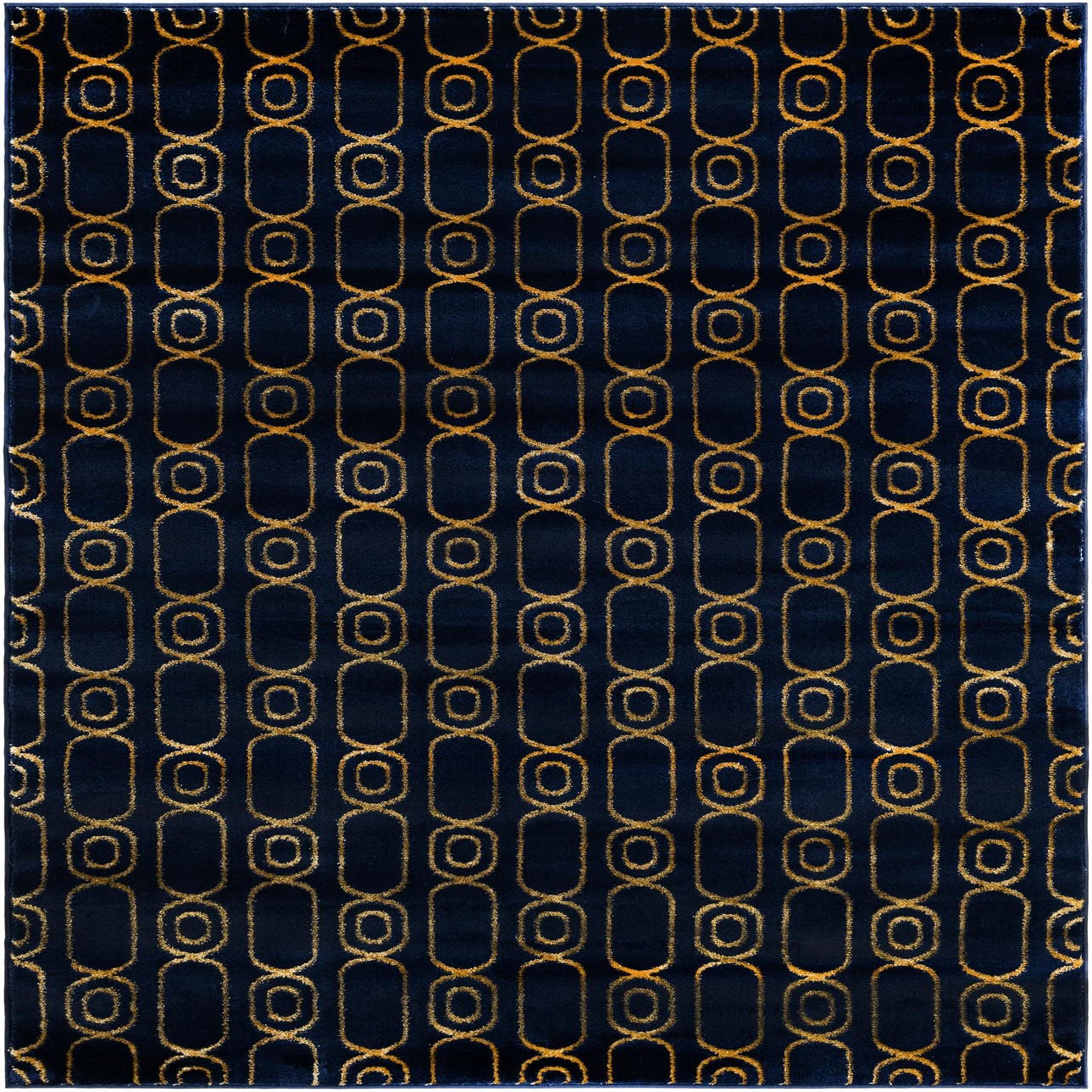 A rectangular 5x8 navy blue area rug with a repeating gold geometric chain-link pattern, suitable for a living room.