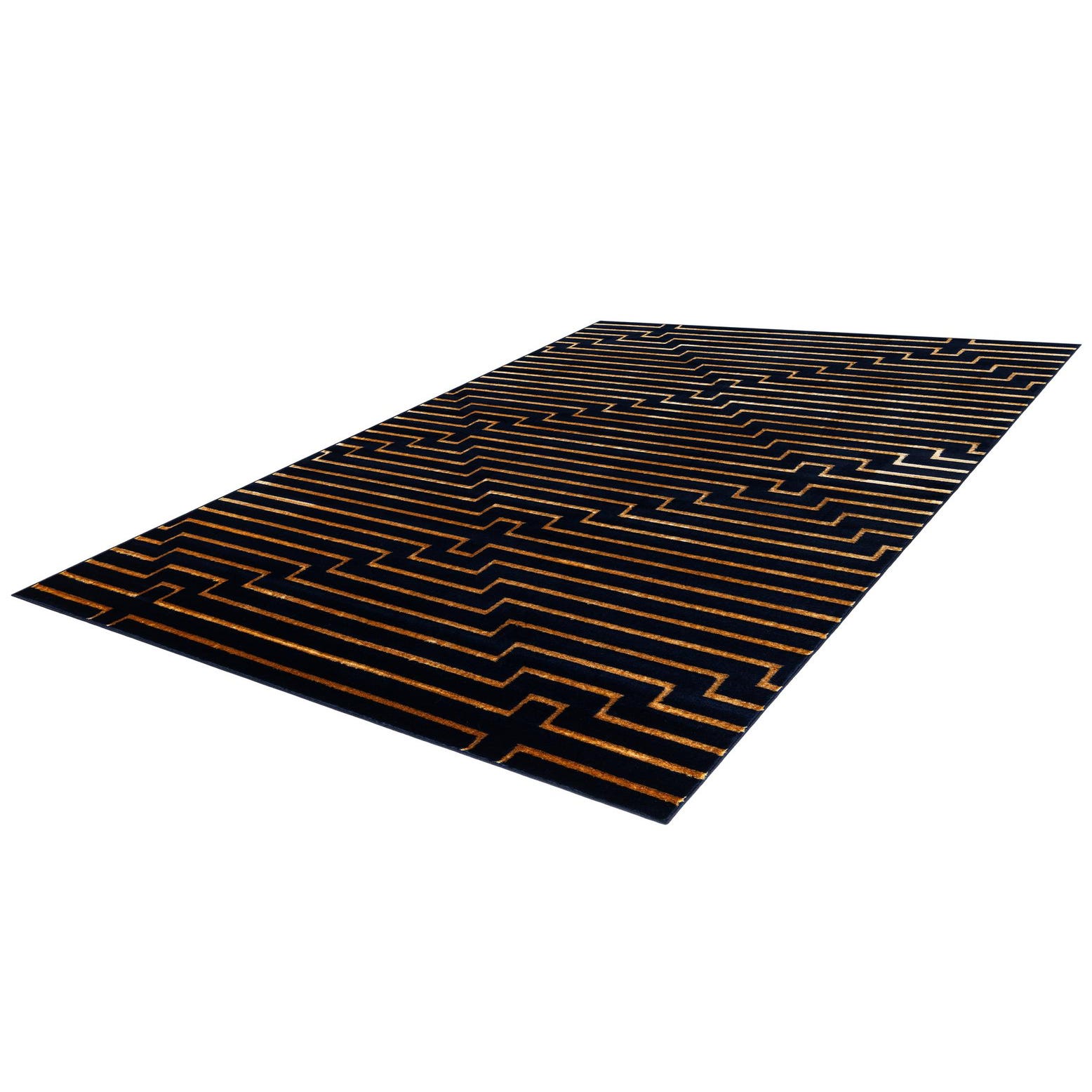 A bold, geometric maze of stepped horizontal lines runs across a deep navy blue field, with warm gold linear accents tracing each step and forming cross-like focal points at regular intervals. The pattern has a modern, slightly Art Deco edge that reads structured and deliberate. Machine-made from 70% polypropylene and 30% polyester, the rug has a dense, low-to-medium pile that feels soft underfoot; the polyester fibers give the gold highlights a subtle sheen against the matte navy background.