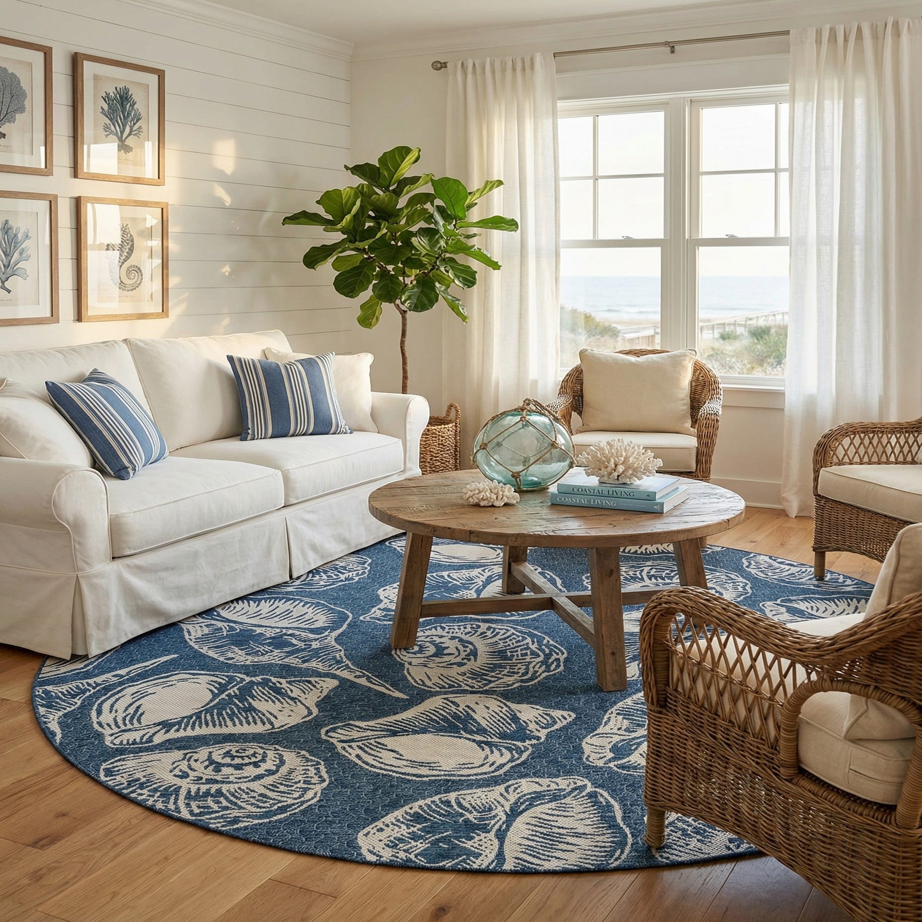 Oversized shell motifs in an ivory sketch-style print float across a deep navy field, creating a seaside-inspired pattern with a casual, drawn-on look. Machine-made of 100% polypropylene, the surface has a low-profile, slightly textured weave that feels firm underfoot and maintains the clarity of the shell detailing. The navy and ivory contrast reads crisp and nautical, and the round shape naturally defines conversation areas, a breakfast nook, or a covered outdoor room.